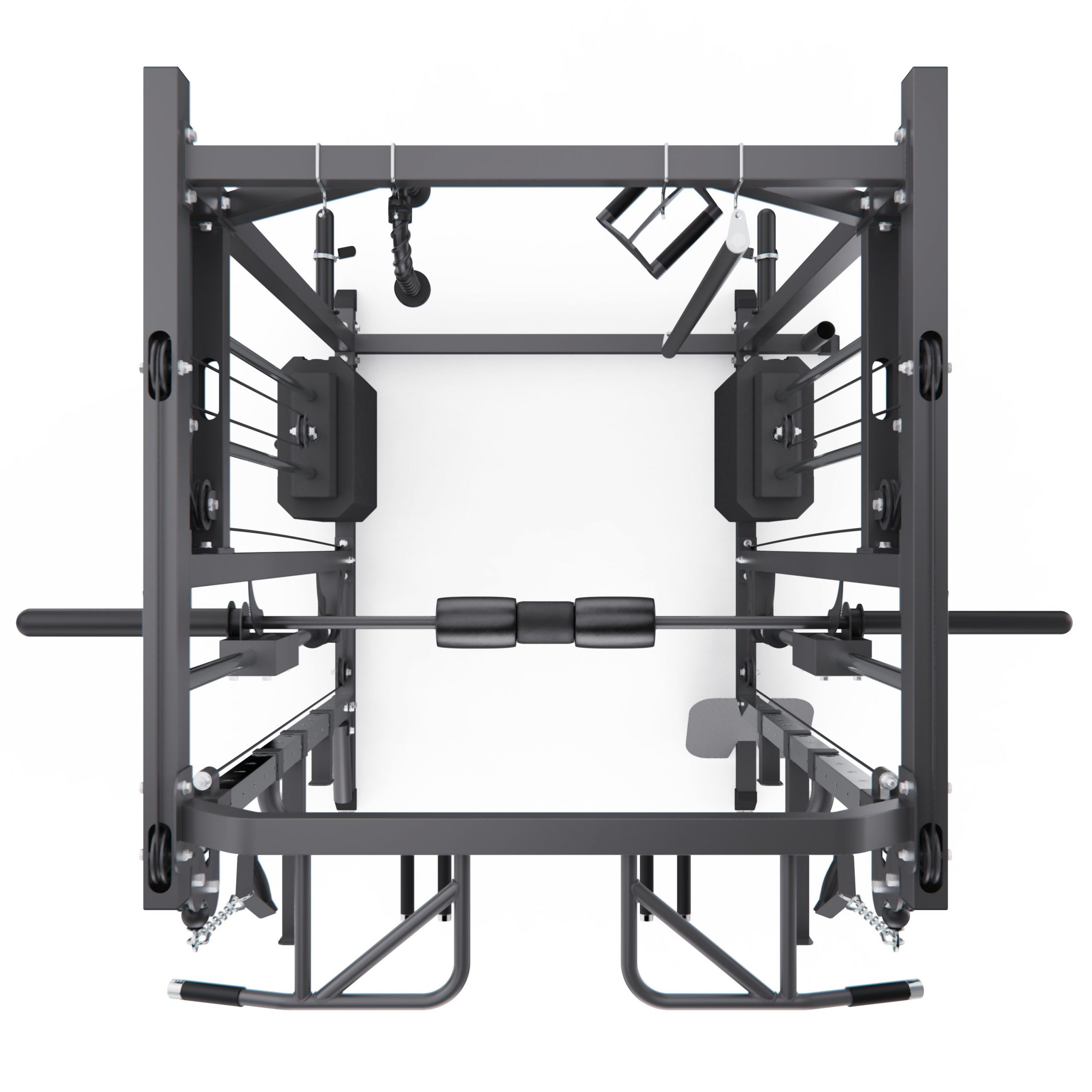 Конструкция объединяет прочие элементы рамы, балки, стойки, рукояти, держатели и предохранители, формируя единую многофункциональную и надёжную систему. Рама выполнена из стального профиля 75 х 50 х 1,5 мм, что обеспечивает высокую жёсткость и устойчивость конструкции при работе с большими весами и гарантирует безопасные и разнообразные тренировки.