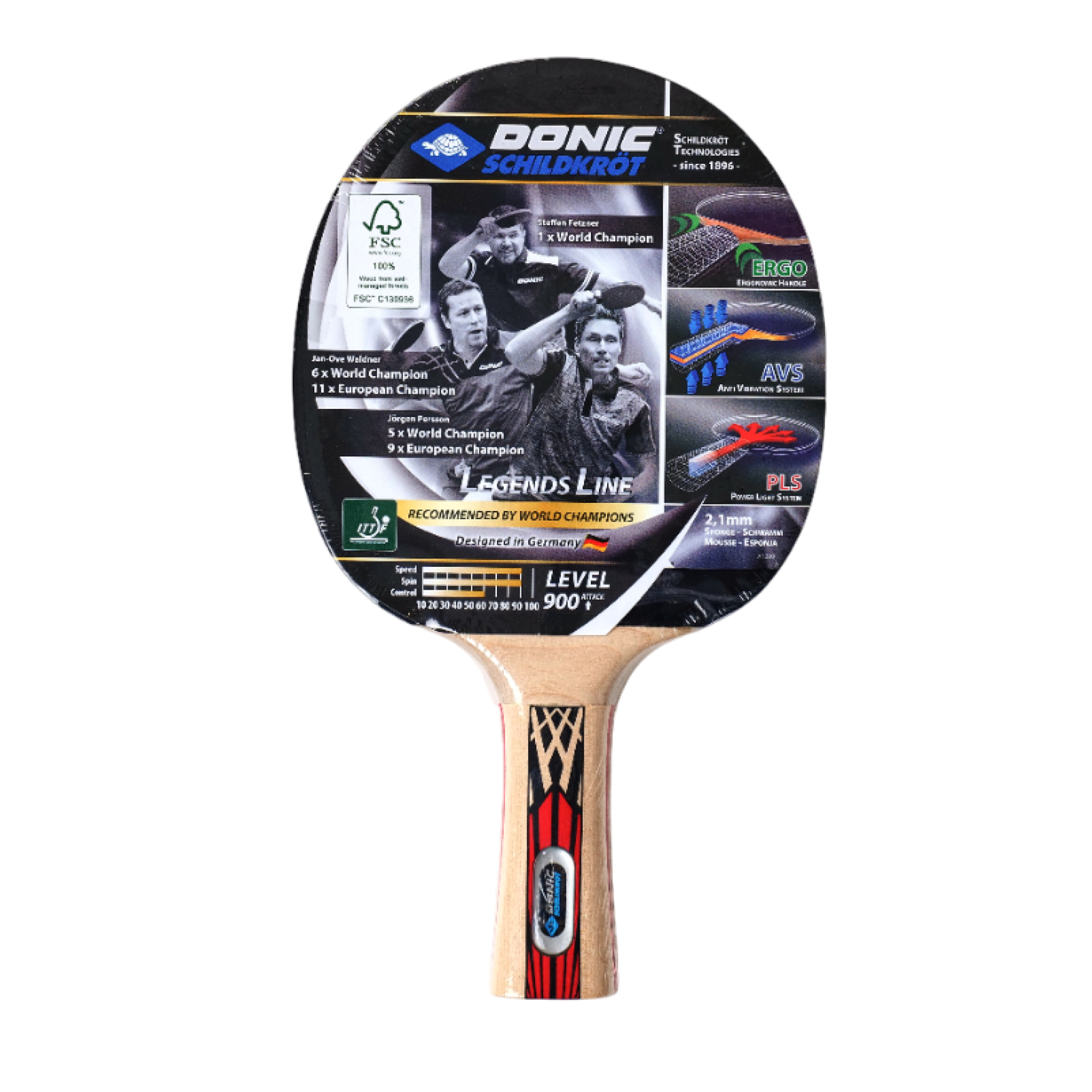 Ракетка DONIC «LEGENDS 900» рассчитана на тип игры Атака. Для покрытия используется накладка Spinmax, а толщина губки 2,1 мм. Форма ручки Concave — ручка, расширяющаяся к концу. Ракетка одобрена Международной федерацией настольного тенниса ITTF.