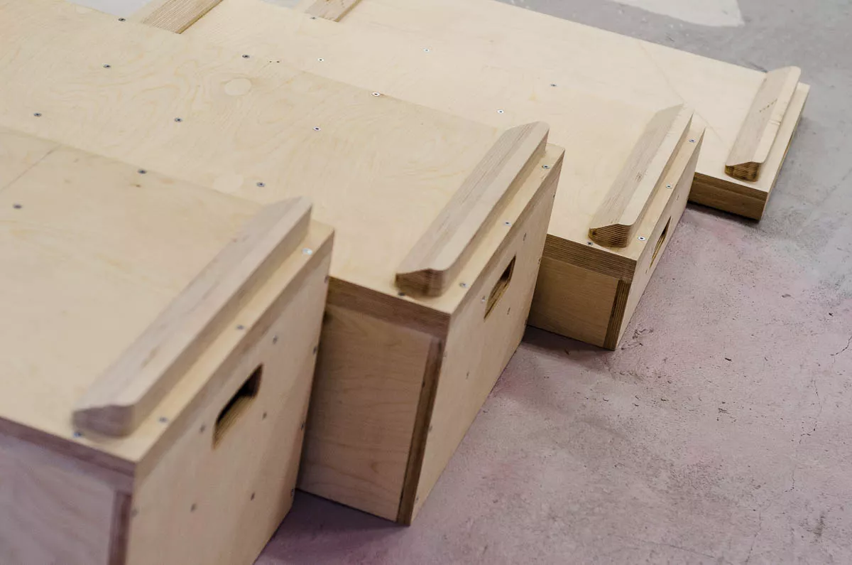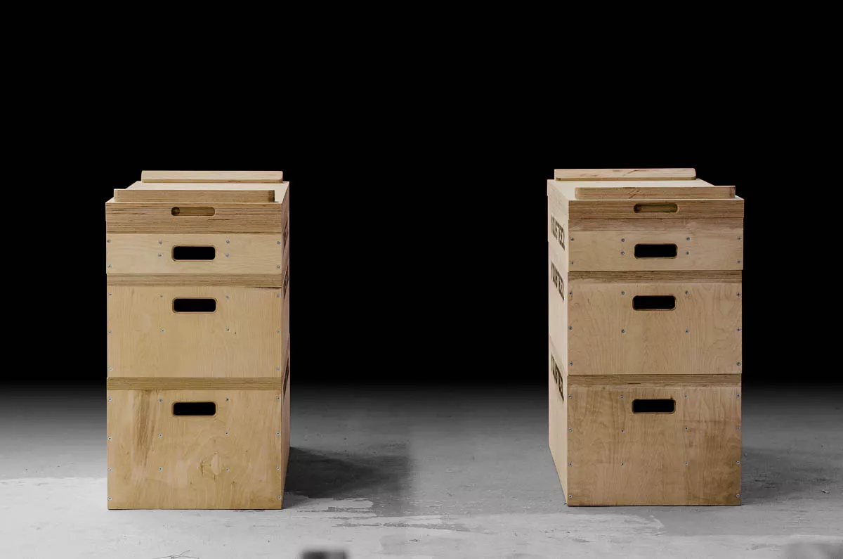 Плинты представляют собой набор специальных деревянных подставок. Набор включает 4 парные секции различной высоты: 60, 150, 300 и 375мм. Общая высота конструкции составляет 885мм, а размер 900х500мм. Каждая секция оснащена парой ручек для переноса и упорами, которые не дают снаряду скатиться. Высокую прочность изделию обеспечивает фанера толщиной 18мм, а верхняя крышка усилена фанерой в 40мм. При желании вы можете комбинировать секции в удобном вам порядке. Вес комплекта: 150кг.