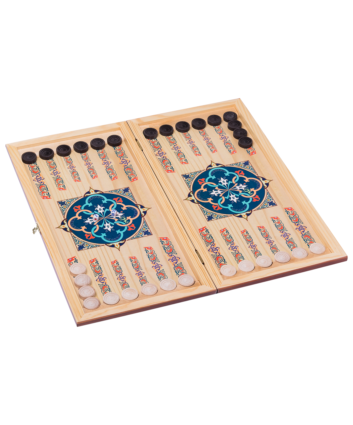 Нарды средние — набор для настольной игры, в который включены доска из натурального дуба, деревянные шашки для игры в нарды и два игральных кубика (зара). Яркий цветной рисунок сразу притягивает взгляд. Модель смотрится нарядно и празднично.