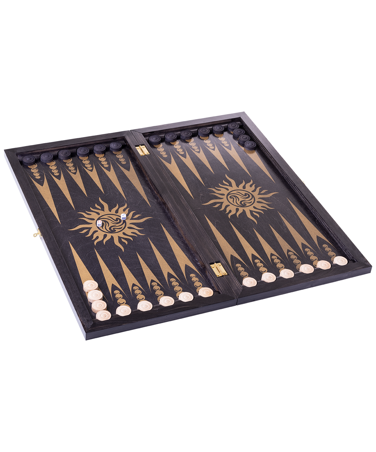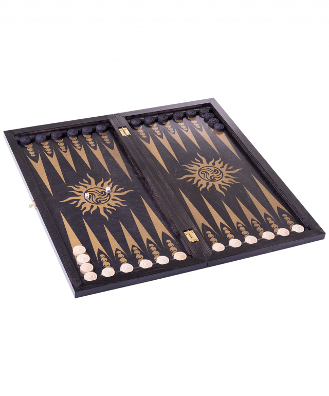Нарды большие «Восточная звезда» — яркая цветная модель популярной настольной игры. В набор включено все необходимое: доска, деревянные удобные шашки и два игральных кубика (зары). Доска выполнена из фанеры, мореной в черный цвет, рисунок (шелкография) золото, покрытие грунт, лак.