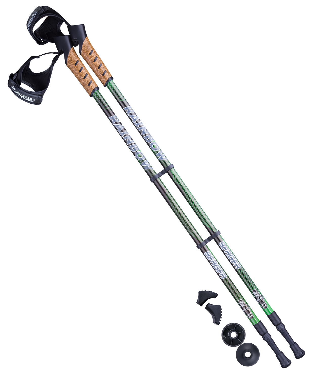 Палки для скандинавской ходьбы Rainbow, 77-135 см, 2-секционные, чёрный/ярко-зелёный Berger