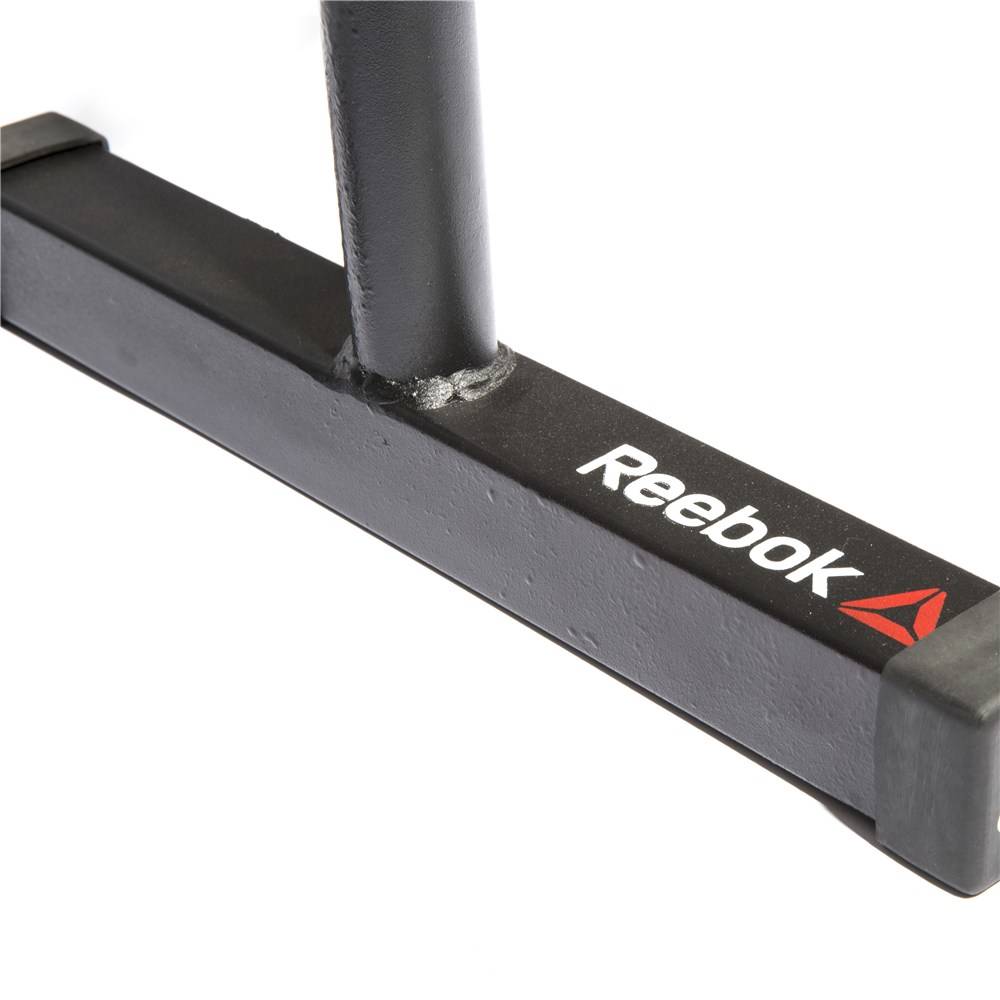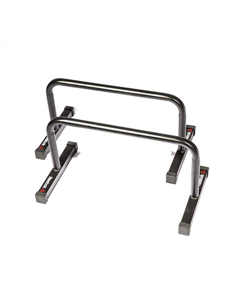 Параллельные брусья являются важным снарядом в функциональном тренинге и Кроссфит. Брусья Reebok изготовлены из прочного стального профиля. Размер: 68 х 38 х 27,5 см. Данная высота является оптимальной для выполнения большинства упражнений, какие обычно выполняются на высоких брусьях (отжимания, выпады и пр.). При тренировке с этим снарядом в первую очередь прокачивается верхняя часть тела — плечи, руки, грудь, спина. Параллельные брусья не сдвинутся с места на протяжении всей тренировке — на ножках предусмотрены резиновые чехлы.