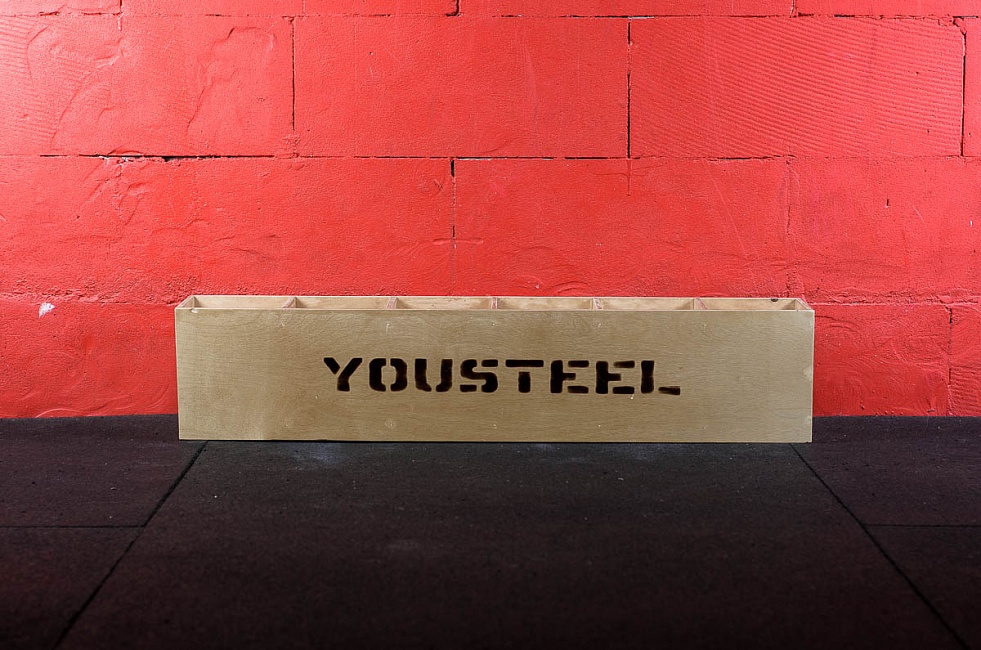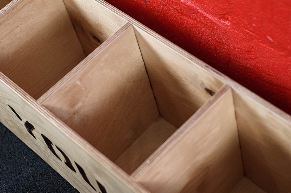 Подставка представляет собой фанерный ящик длиной 1100 см с шестью квадратными отсеками 17 на 17 см, достаточно широкими и глубокими, чтобы уверенно удерживать роллер. В отделениях ящика Вы также можете хранить замки, резиновые петли и прочие мелкие аксессуары. Подставка покрыта лаком, который защищает фанеру от внешнего воздействия, а руки клиентов от царапин и заноз.