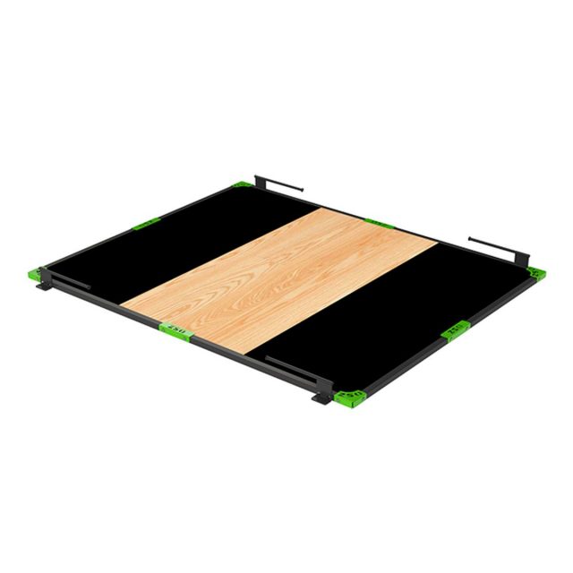Помост представляет из себя разборную конструкцию с резиновыми амортизаторами и фанерным настилом. Каркас помоста выполнен из профиля 40 х 40 х 2 мм, скрепленного между собой с использованием углового профиля и уголка. Центральная часть заполнена фанерным настилом, что обеспечивает надежную устойчивость тяжелоатлета, т.к. отсутствуют на настиле стыки. Боковые части заполнены плиткой резиновой, которая гасит удар штанги при падении на пол. Покраска выполнена методом порошковой окраски. В комплект помоста входят кронштейны для крепления резиновых петель, служащих в качестве дополнительной нагрузки при выполнении упражнений.