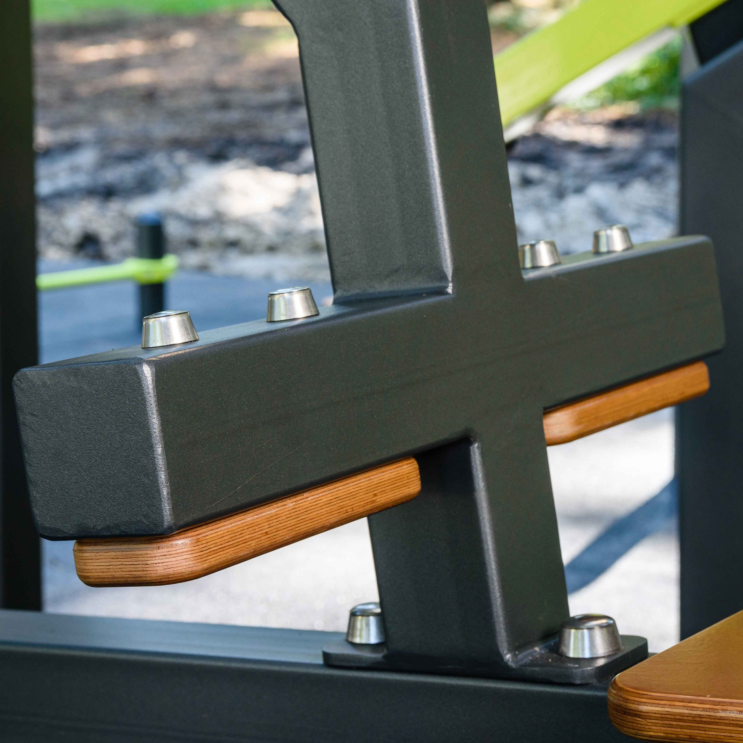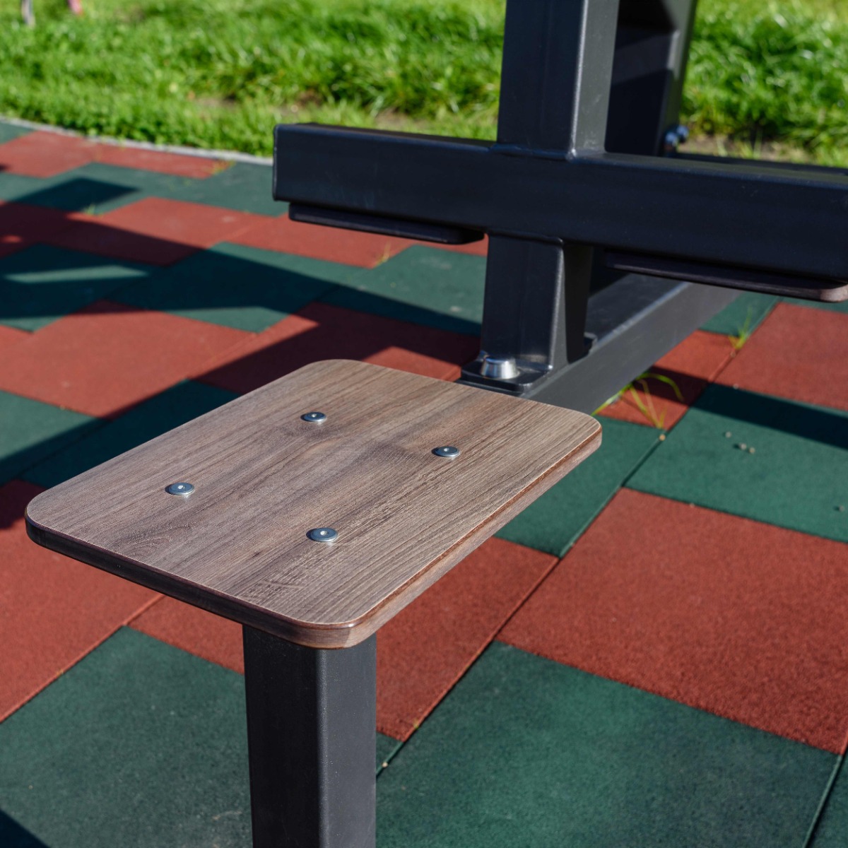 Надёжность и прочность разъёмных соединений конструктивных элементов тренажёра обеспечиваются за счёт использования высококачественного оцинкованного крепежа, выступающие части которого закрыты металлическими защитными колпачками.
