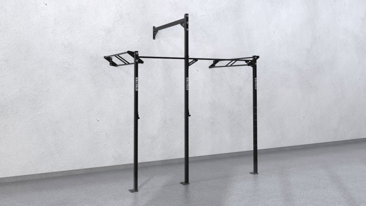 Пристенная рама представляет собой конструкцию, состоящую из трех опорных стоек из профильной трубы 80х60 мм, прикрепленных к полу. Высота стоек – 2810 мм и 3660 мм, что позволяет крепить к ним такие снаряды, как гимнастические кольца и канаты. В верхней части стойки соединяются перекладинами. В комплект входят двойные и одинарные перекладины. Функциональная рама крепится к стене в трех точках, что придает ей хорошую устойчивость и прочность.
