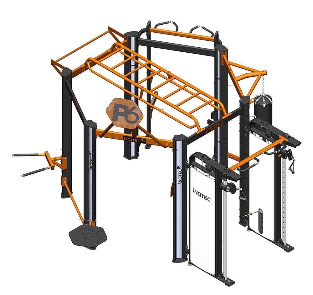 Профессиональный комплекс Inotec P6 TOP является универсальной системой для тренировки всех групп мышц. Он предназначен для профессиональных спортивных залов и фитнес-центров, где проводятся групповые тренировки, тренировки по кроссфиту, а также индивидуальные занятия. Комплекс включает в себя несколько элементов, таких как кольца, турники, силовые станции и элементы для работы с канатами и снарядами.