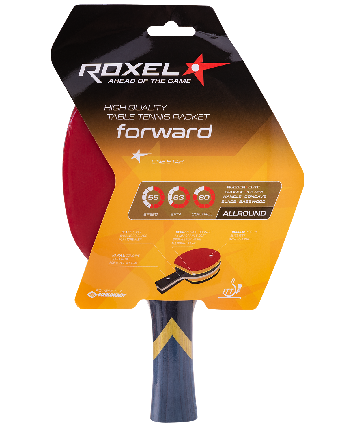 Ракетка 1* Forward бренда Roxel разработана для игроков, цель которых совершенствование базовых навыков владения мячом и ракеткой. Благодаря высокому показателю контроля ракетка прощает ошибки при подаче мяча, повышенные показатели скорости и вращения помогают освоить первые технически сложные элементы игры. Накладки Elite от Schildkröt.