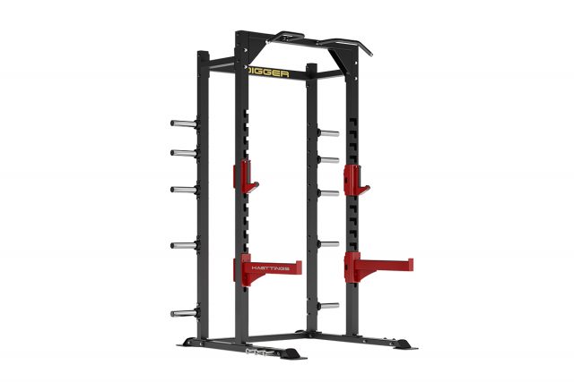 Кронштейны для поддержки грифов легко перемещаются вверх-вниз по раме, в зависимости от роста и потребностей спортсмена. Адаптеры для хранения дисков располагаются на различных уровнях, что позволяет быстро добавить или снизить вес снаряда. Свободная конструкция рамы позволяет установить скамейку для выполнения упражнений «жим лежа» и «жим сидя». Также рама снабжена обрезиненным турником для выполнения подтягиваний или иных упражнений.