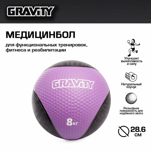 Резиновый медбол Gravity, 8кг, фиолетовый