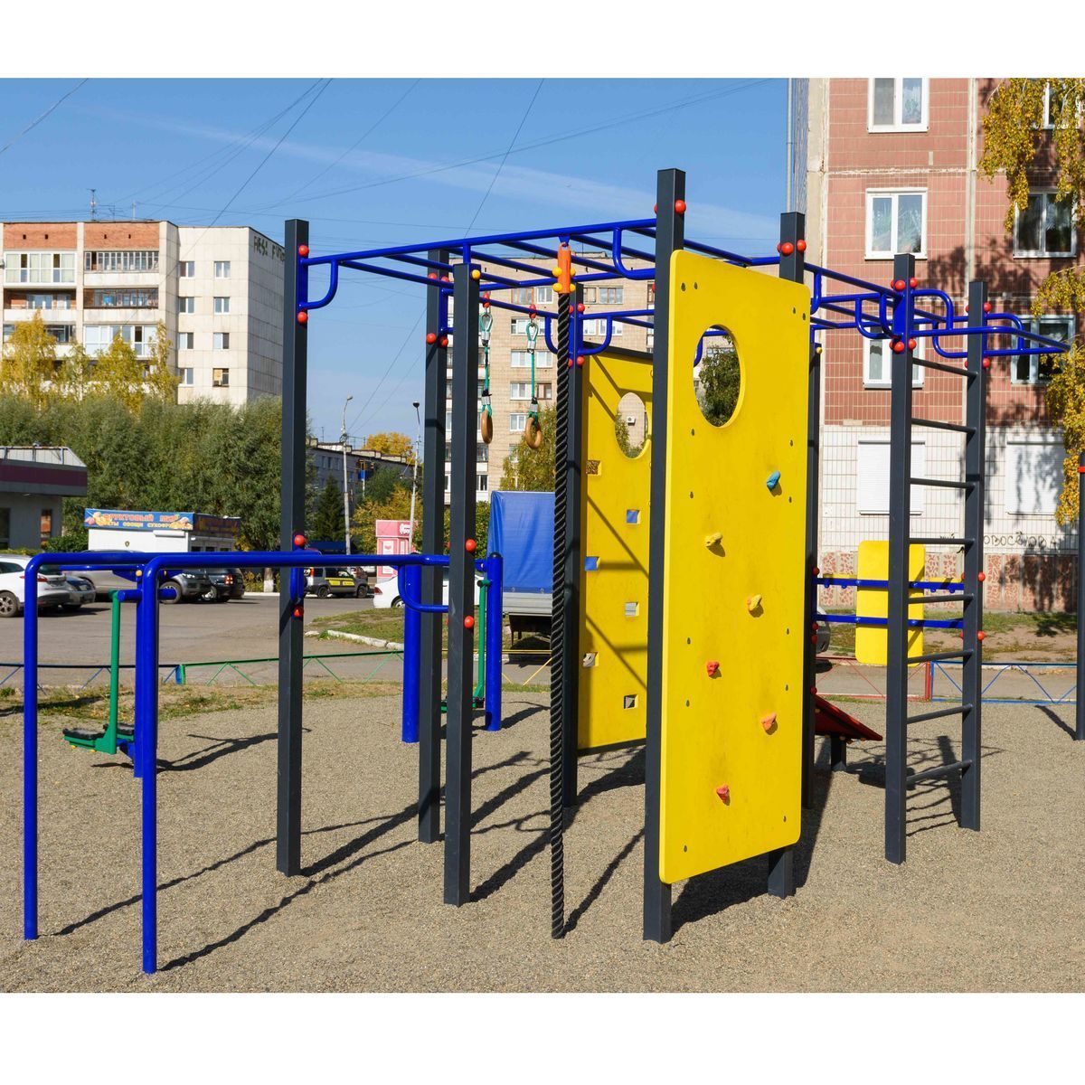 Конструкция комплекса рассчитана на круглогодичное использование и безопасна для детей. Оптимально подобранное сочетание спортивных снарядов – шведская стенка, турники, брусья, рукоходы, кольца, канат и скалодром – создаёт условия для гармоничного физического развития ребёнка: укрепления мышц, развития координации, ловкости и силы.