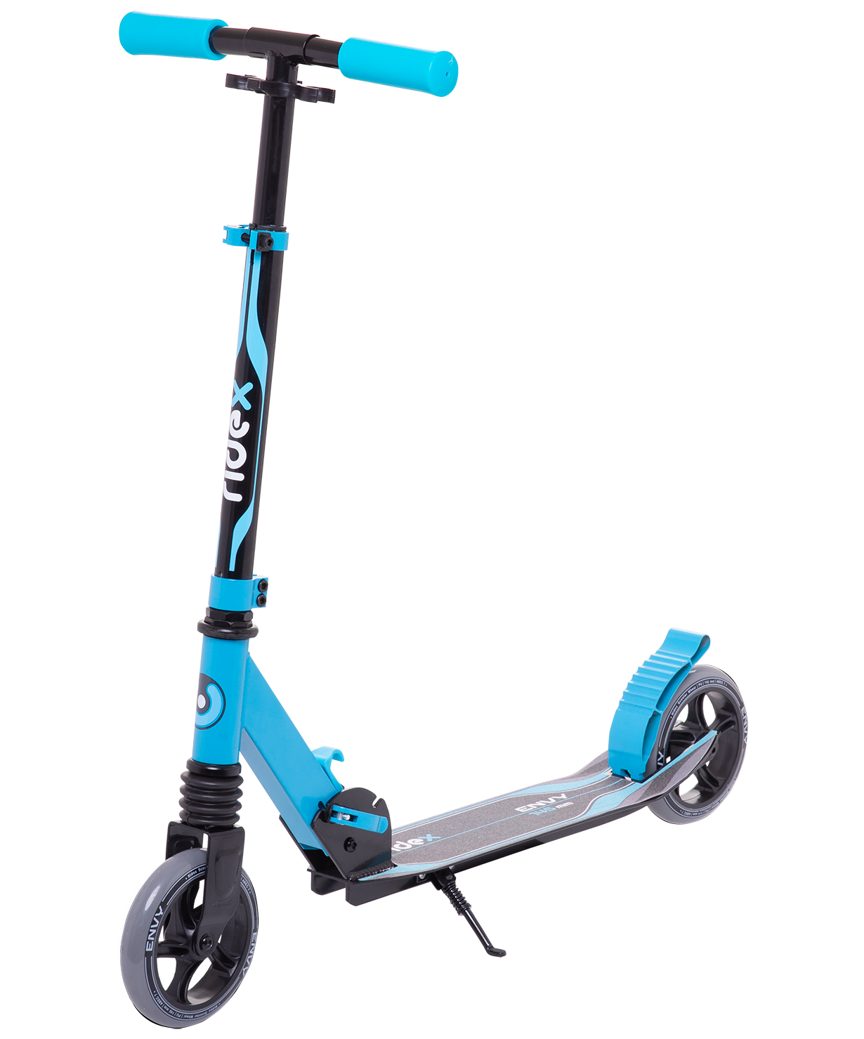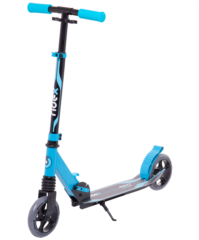 Детский самокат с заниженной декой и передним амортизатором для более комфортного катания.