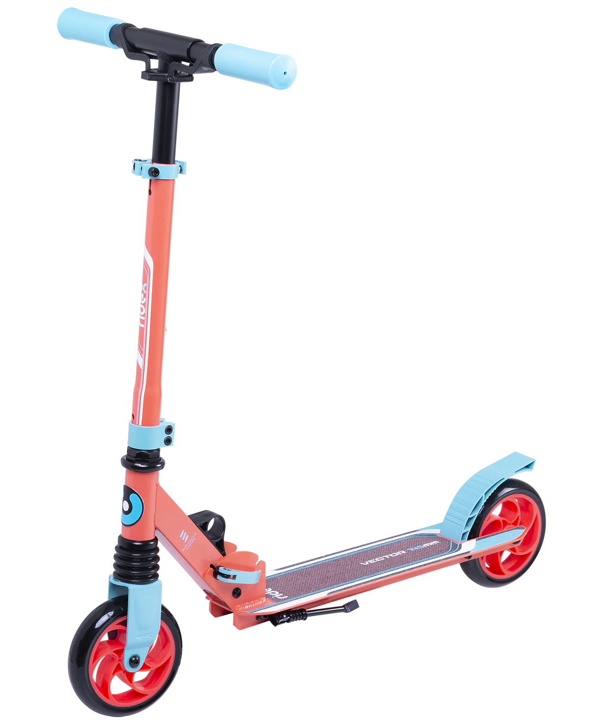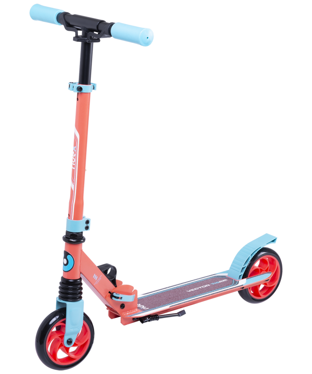 Детский самокат с нескользящими резиновыми грипсами, удобной подножкой и передним амортизатором для более комфортного катания.