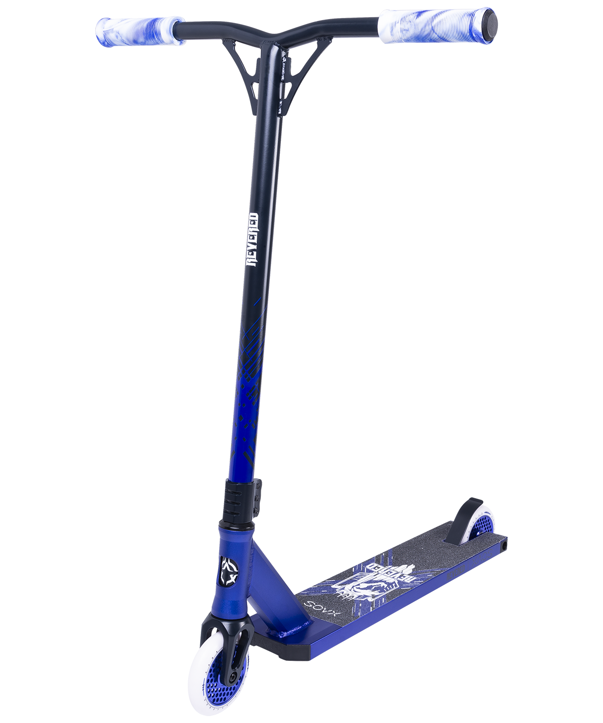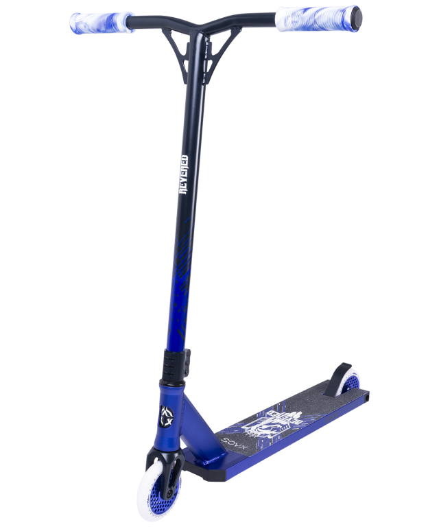 Отличительное цветовое решение в стиле Royal Blue ярко выделит эту модель среди всех остальных. Анодированная квадратная дека создана из сплава алюминия, что делает модель Revered одной из самых прочных и лёгких в своей категории. Руль Revered отличается повышенной надежностью, а 3-болтовый фрезерованный зажим обеспечивает работу системы компрессии HIC. Колеса диаметром 110 мм имеют цельнокомпозитные диски с уникальным дизайнерским решением в виде «пчелиных сот», которые помимо всего прочего значительно облегчают самокат.