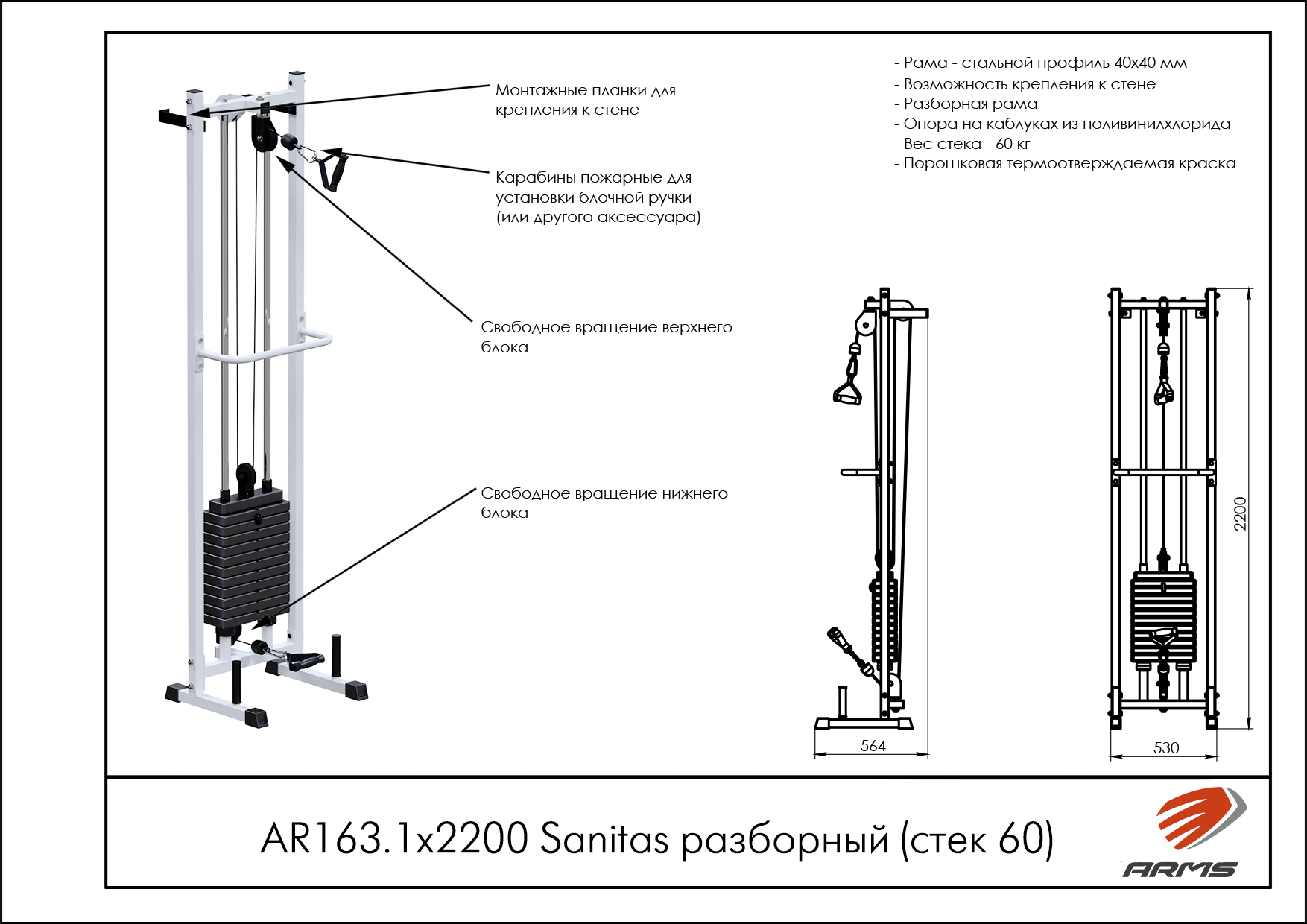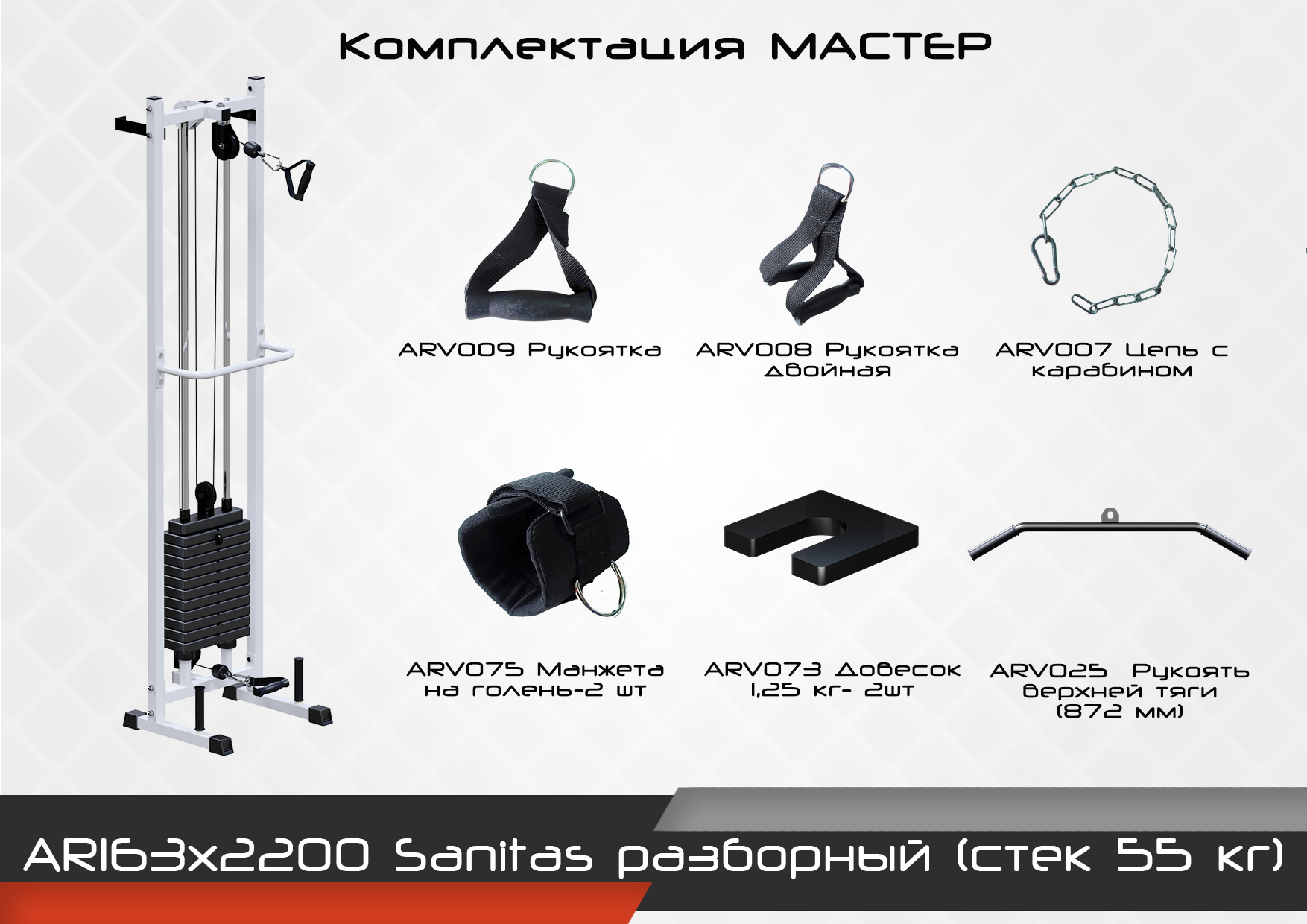 Тренажер Sanitas предназначен для выполнения широкого ряда упражнений: развитие мышц пресса, груди, всех мышц рук и ног, а также реабилитационных упражнений таких заболеваний как остеохондроз, боли в шее, суставах и т.д.