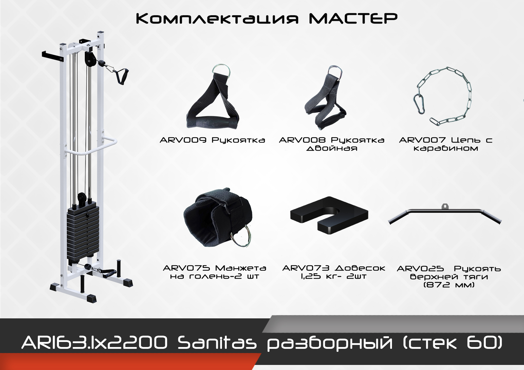 Тренажер Sanitas предназначен для выполнения широкого ряда упражнений: развитие мышц пресса, груди, всех мышц рук и ног, а также реабилитационных упражнений таких заболеваний как остеохондроз, боли в шее, суставах и т.д.