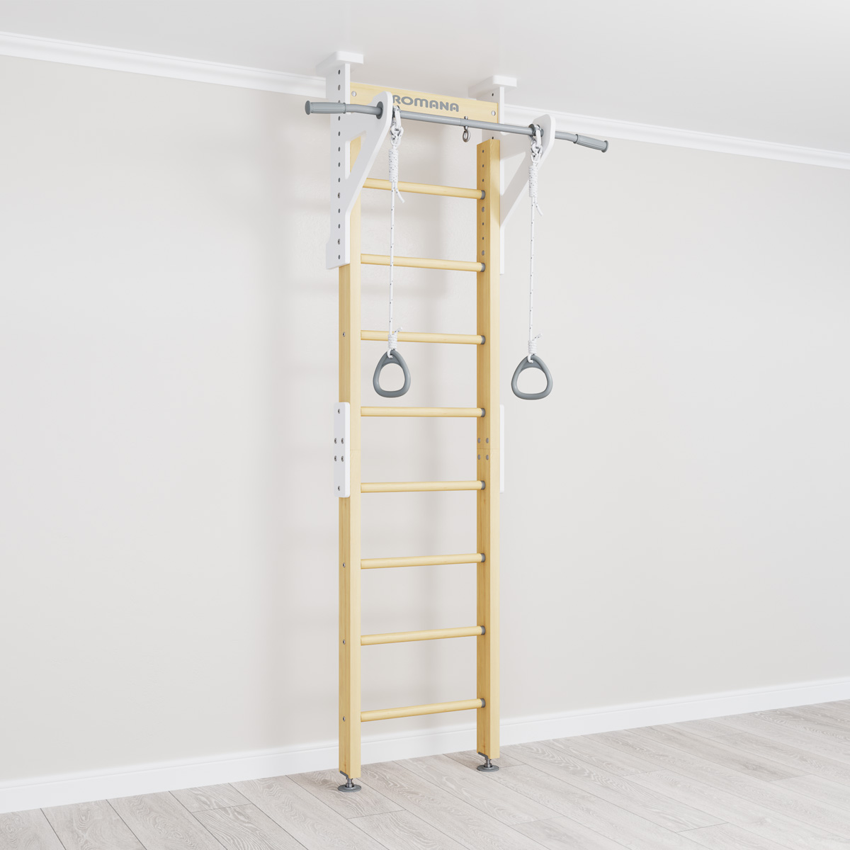Спортивный комплекс ROMANA Eco1.1 устанавливается как враспор, так и к стене — пользователь сам выбирает удобный вариант монтажа. Таким образом, стенку можно установить практически в любом месте дома. В комплексе Eco1.1 предусмотрен фиксированный турник, а также кольца, которые можно разместить на нем.