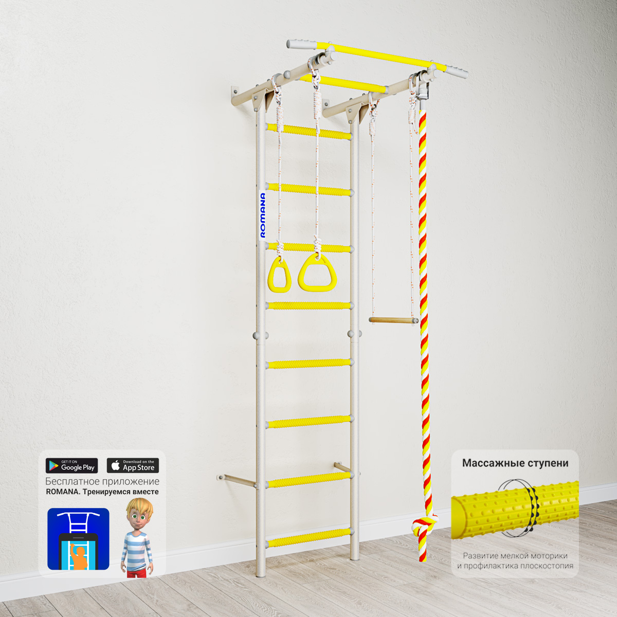 Модель ДСК ROMANA Karusel S1 относится к «поколению 2018» и поставляется в обновленной цветовой гамме и с новым, приятным цветом фурнитуры. Теперь это не просто тренажер, а настоящее украшение детской комнаты. Добавьте к этому бесплатное приложение «ROMANA. Тренируемся вместе» , и вы поймете, что физкультура — это весело!