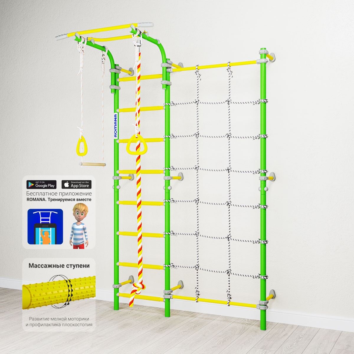 Весь комплекс ROMANA Karusel S3 обновил цветовую гамму до более ярких, привлекательных цветов в «поколении 2018». Изменился цвет фурнитуры на светло-серый. В дополнение к комплексу мы предлагаем скачать бесплатное приложение «ROMANA. Тренируемся вместе» — займитесь физкультурой в новом формате!