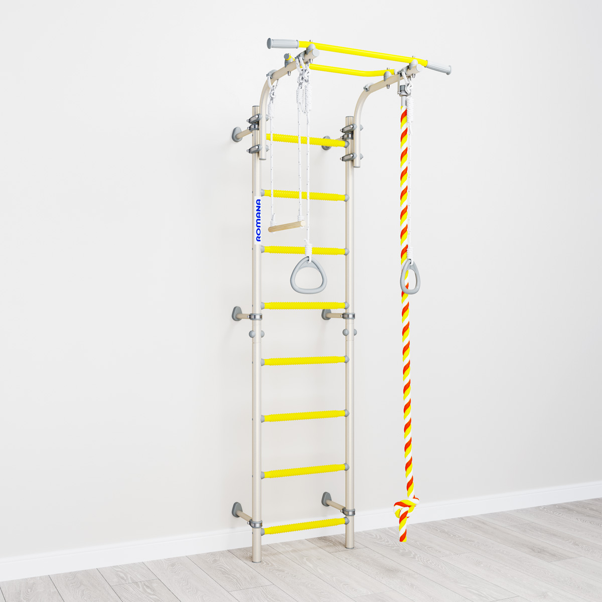 Детский спортивный комплекс ROMANA Next Top — настоящий хит в линейке шведских стенок. Он легко собирается и фиксируется к стене с помощью подвижных крепежей. Они позволяют зафиксировать стенку в различных положениях, включая угловое. Можно рационально расположить крепеж на той высоте, которая вас устроит, и избежать попадания в проводку или полости в стене.