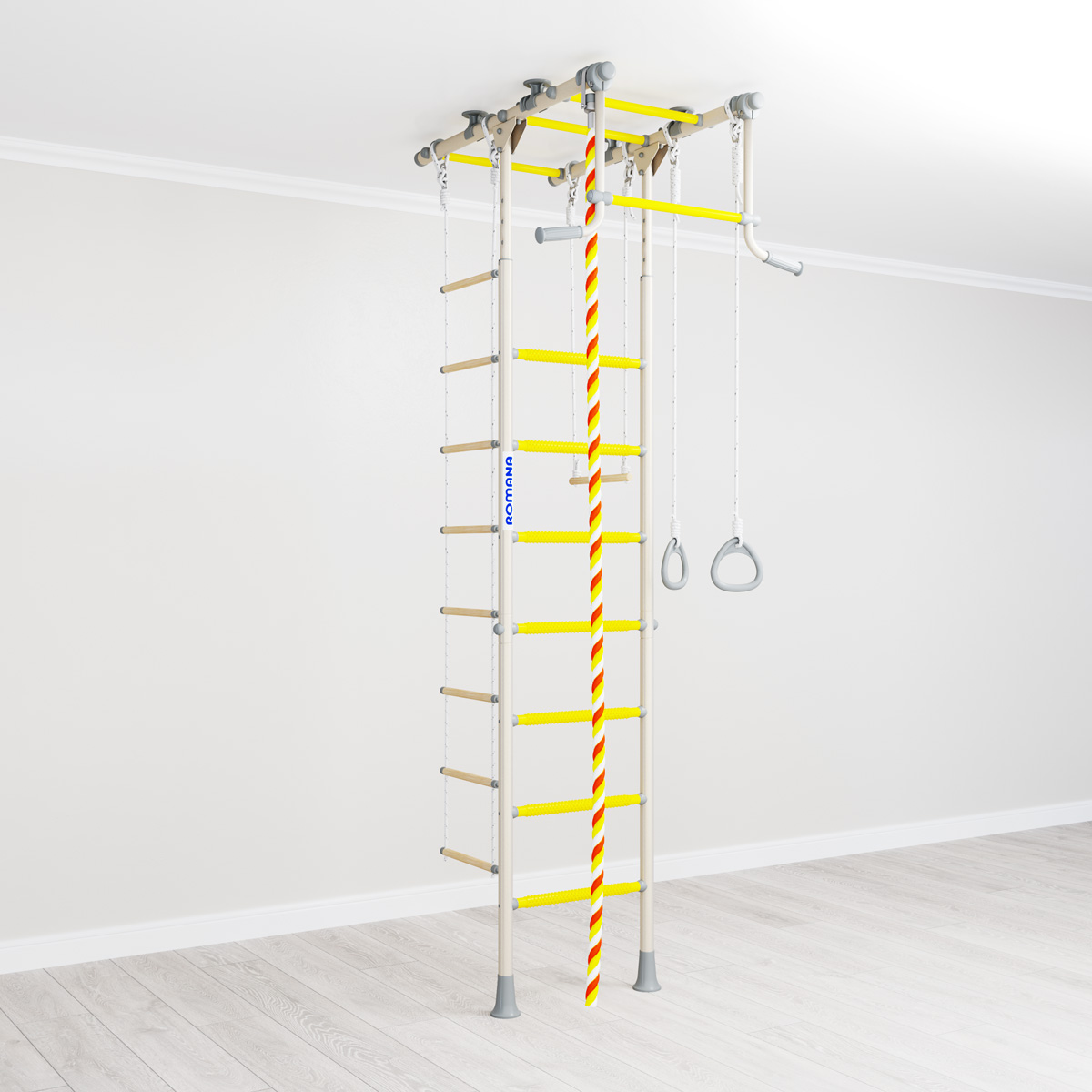 Конструкция ROMANA R1 надежно устанавливается враспор к потолку, выдерживает вес в 100 кг (испытывается при нагрузке в 200 кг). В самом комплексе широкий выбор навесного оборудования: веревочная лестница, трапеция, кольца, канат. Ступени с массажным эффектом развивает моторику рук и служат профилактикой плоскостопия.