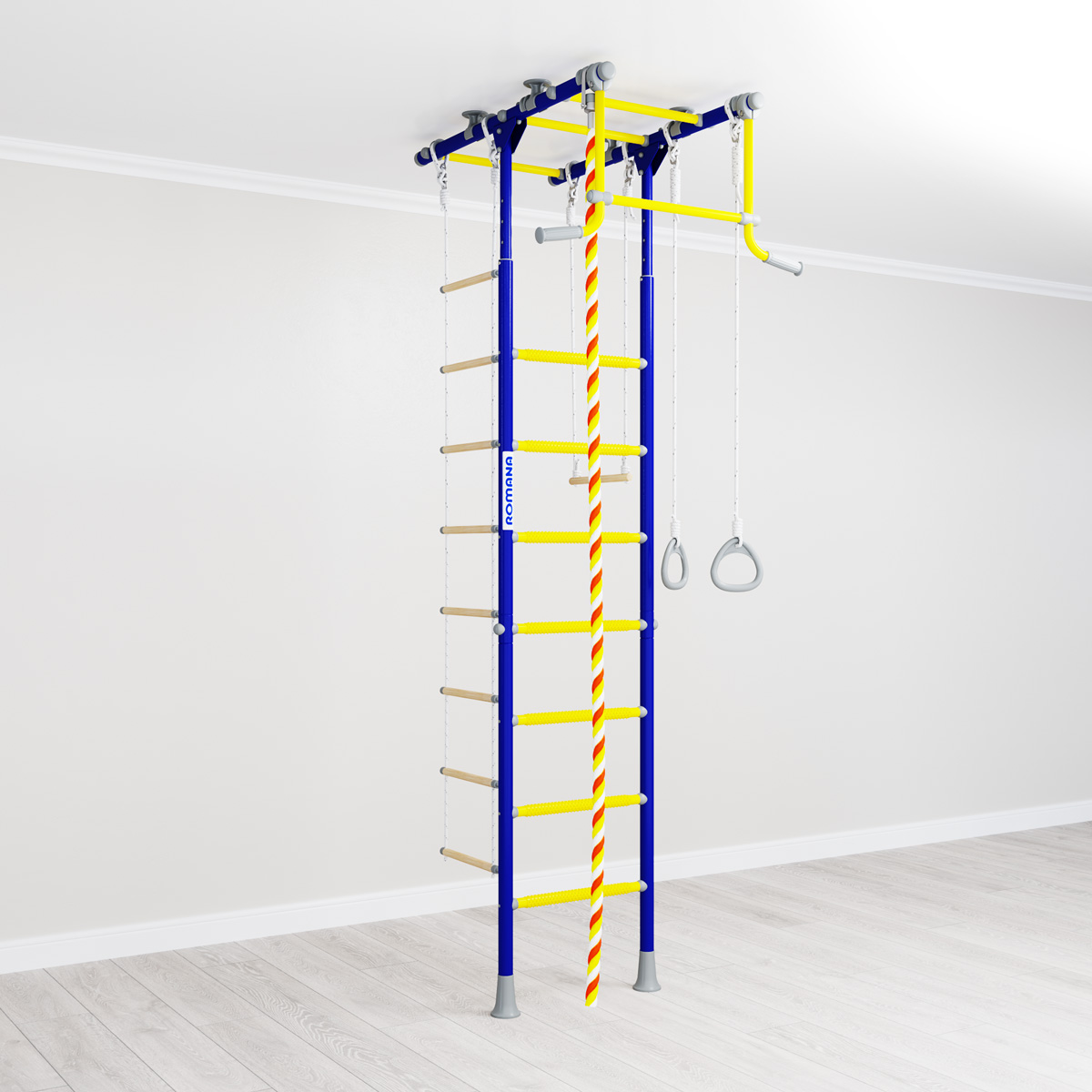 Конструкция ROMANA R1 надежно устанавливается враспор к потолку, выдерживает вес в 100 кг (испытывается при нагрузке в 200 кг). В самом комплексе широкий выбор навесного оборудования: веревочная лестница, трапеция, кольца, канат. Ступени с массажным эффектом развивает моторику рук и служат профилактикой плоскостопия.