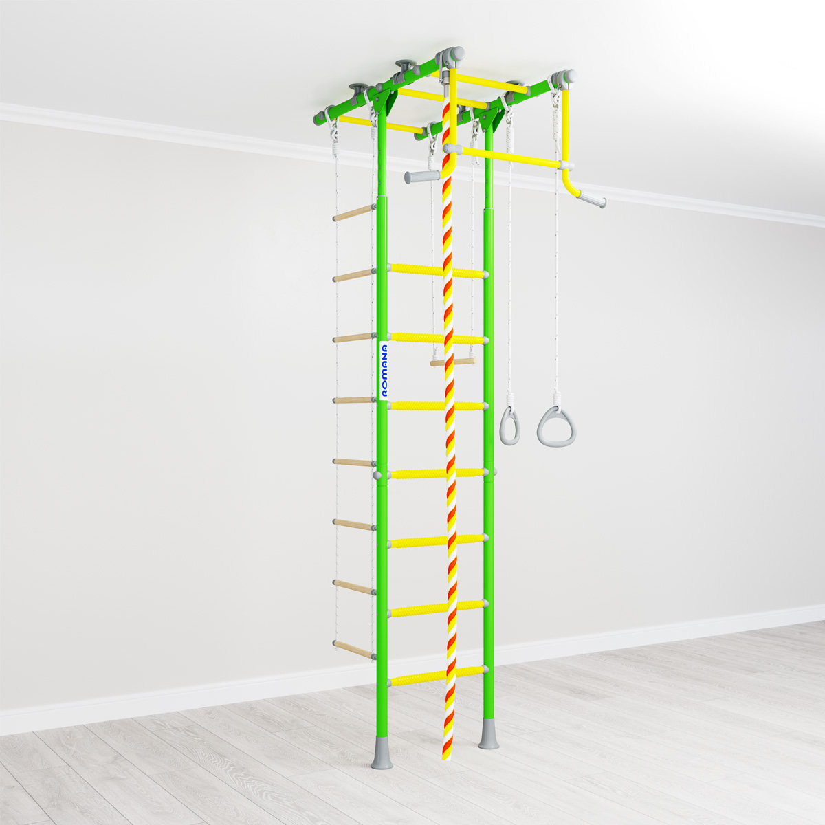 Конструкция ROMANA R1 надежно устанавливается враспор к потолку, выдерживает вес в 100 кг (испытывается при нагрузке в 200 кг). В самом комплексе широкий выбор навесного оборудования: веревочная лестница, трапеция, кольца, канат. Ступени с массажным эффектом развивает моторику рук и служат профилактикой плоскостопия.
