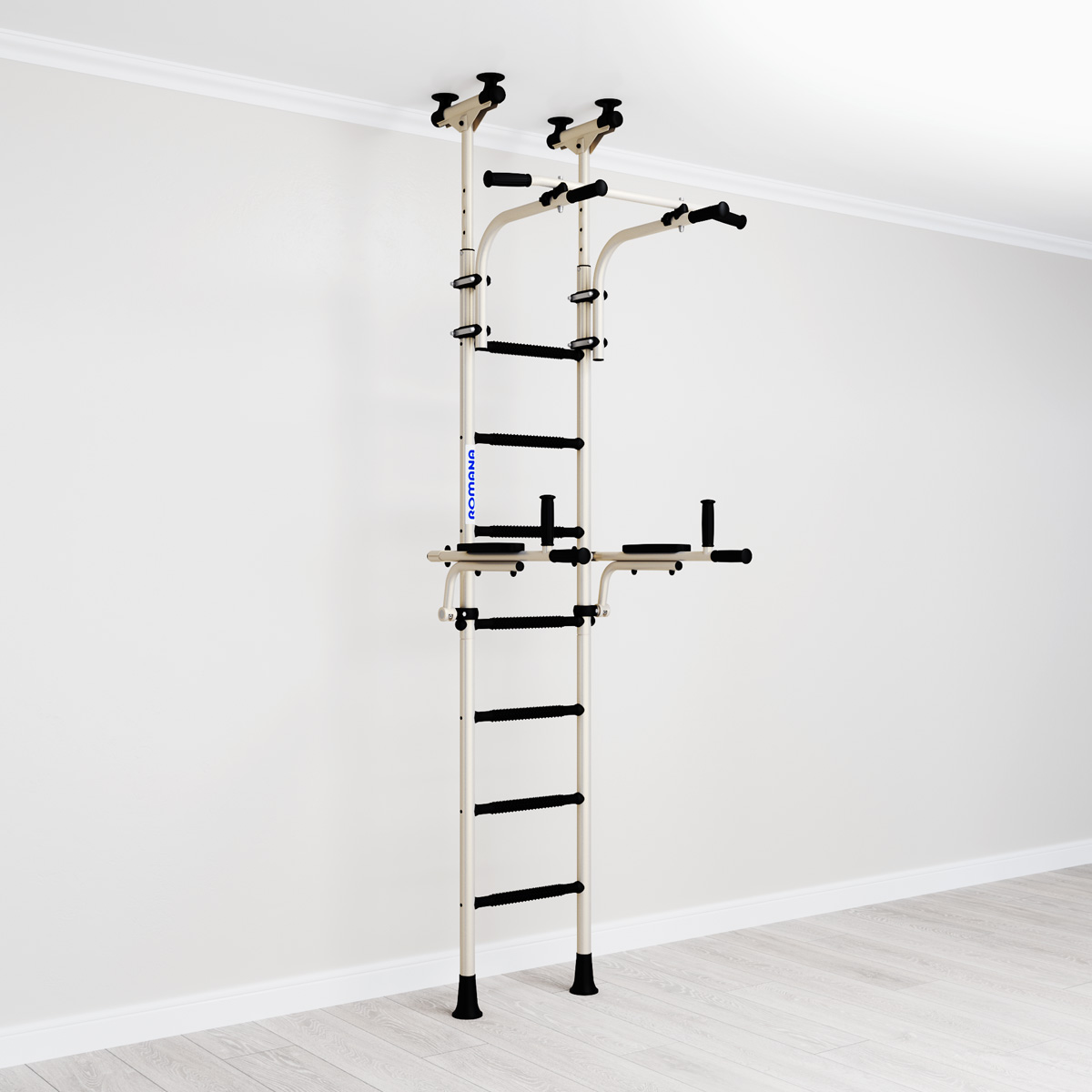 Спортивный комплекс ROMANA R10 — хороший выбор для занятий физкультурой всей семьей. Ввиду лаконичного дизайна, он также будет оптимальным решением как для офиса так и для комнаты современного подростка. Шведская стенка крепится враспор, между полом и потолком; подходит для помещений с гипсокартонными стенами. По желанию ее можно легко переместить в другое место комнаты.