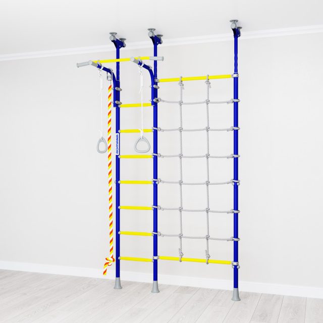 Детский спортивный комплекс ROMANA R3 устанавливается враспор, поэтому для его установки не нужно сверлить стены. У этого комплекса есть преимущество перед рядом распорных моделей — предусмотрен перемещаемый турник, который можно крепить на любой высоте с помощью специальных удобных хомутов.