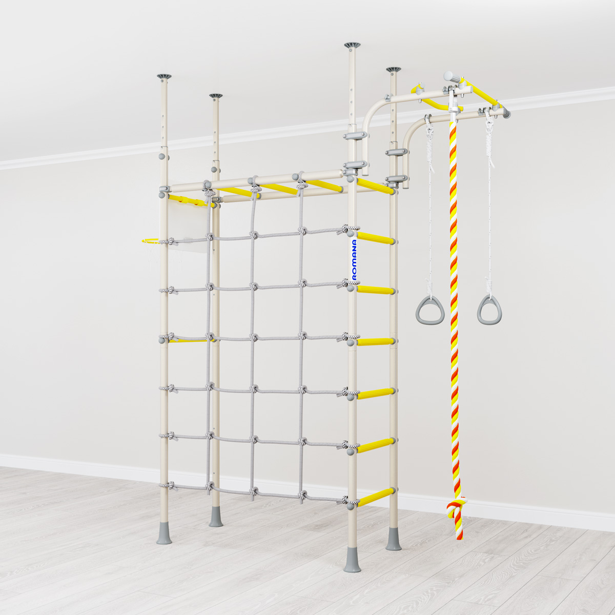 Детский спортивный комплекс ROMANA R4 — многофункциональный комплекс для дома, где предусмотрено все для выполнения упражнений и увлекательных физкультурных занятий. Он устанавливается враспор к полу и потолку в любом подходящем месте дома или квартиры.Турник фиксируется на любой высоте надежными хомутами, их можно перемещать по вертикали на рамах комплекса. Рукоход также можно закрепить на удобной высоте,подходящей под вашего ребенка.