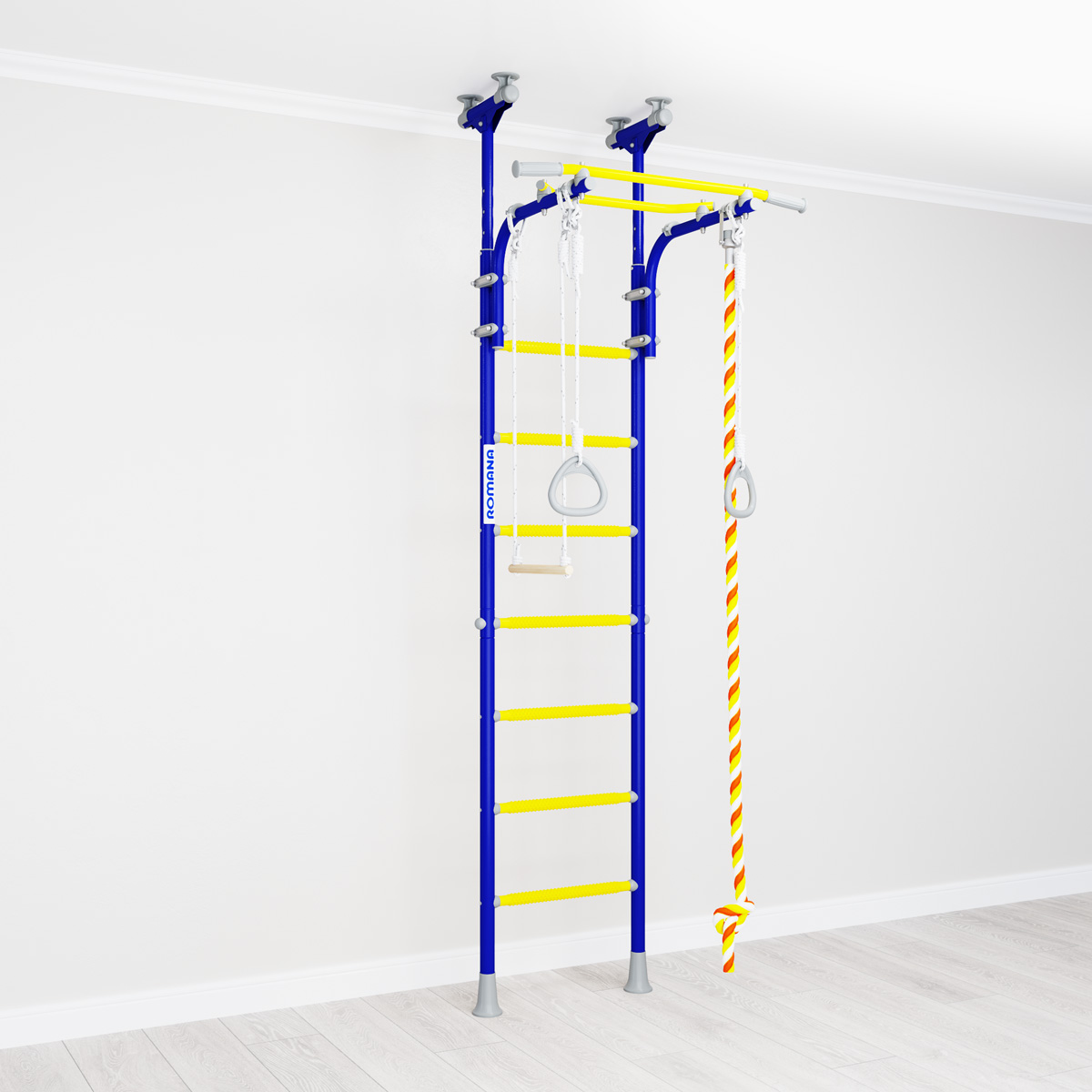 Детский спортивный комплекс ROMANA R5 Kometa — современная шведская стенка с возможностью установки враспор к полу и потолку. Не нужно сверлить стену и крепить к ней раму. Металлокаркас стенки рассчитан на вес в 100 кг (испытан нагрузкой в 200 кг).