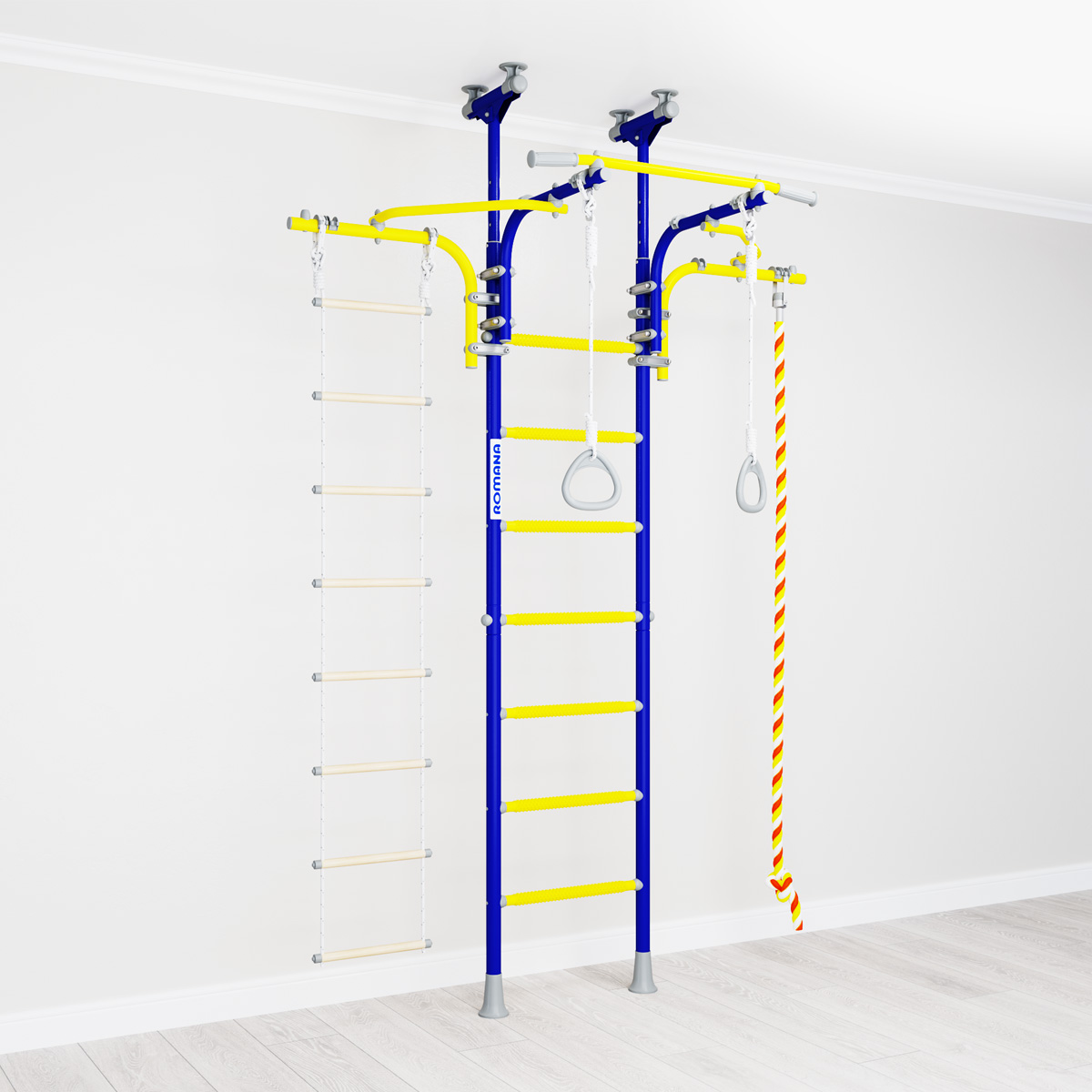 Детский спортивный комплекс ROMANA R6 один из самых увлекательных комплексов для ребенка любого возраста, с креплением пол-потолок (враспор). Его легко установить в любом удобном месте дома или квартиры. Взбираясь по веревочной лестнице, ребенок может ухватиться за перекладину,ведущую к турнику, с него переместиться на канат и затем спуститься вниз- эта мини игра так увлекательна для маленьких искателей приключений. Убрав перекладины можно перемещать турник пониже, для занятий маленьких детей — все делается быстро и легко, благодаря новым хомутам.