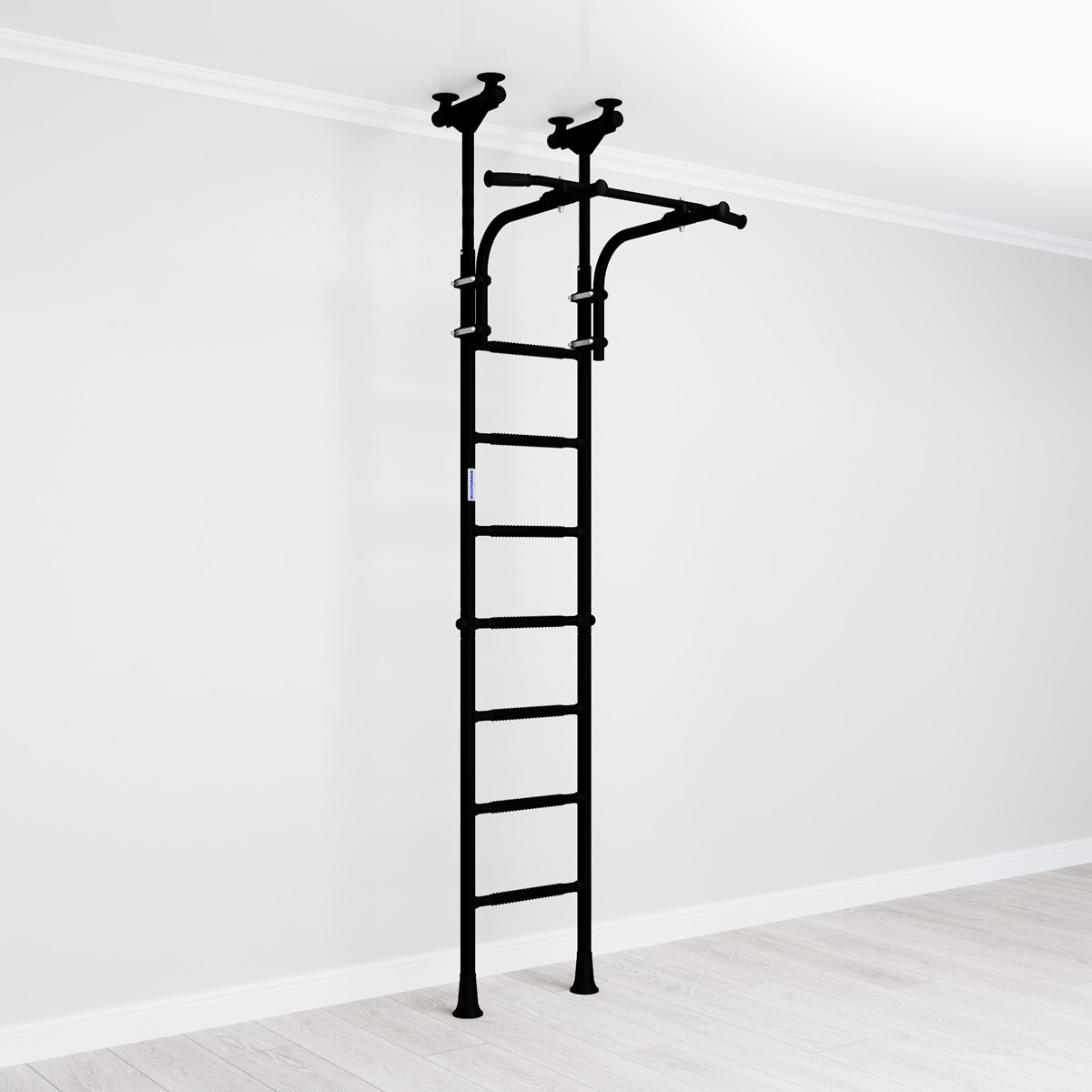 Спортивный комплекс ROMANA R9 — универсальное решение для квартиры или дома. Он устанавливается в распор. Обладает лаконичным дизайном, можно выбрать из двух расцветок — черный или черно-белый. В комплекте идет лестница и регулируемый по высоте турник. Его можно перемещать по вертикали, подстраивая под рост тренирующегося. Металлоконструкция комплекса выдерживает вес до 100 кг (испытывается при 200 кг). Хотите добавить откидные брусья, обратите внимание на комплекс ROMANA R10.