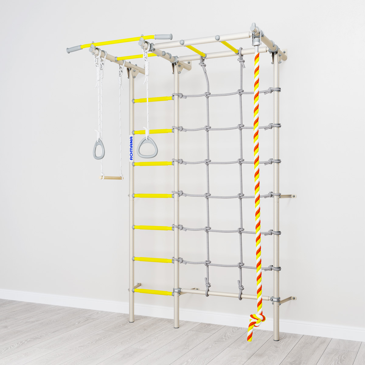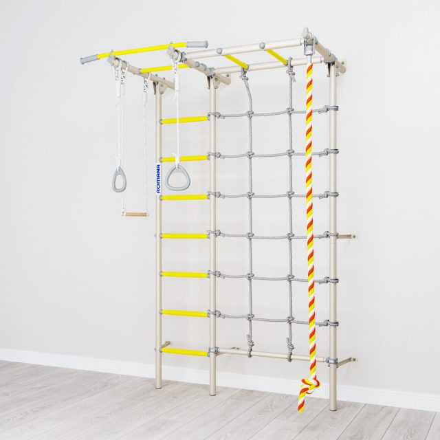 В детском спортивном комплексе ROMANA S7 есть все, что нужно юному искателю приключений: удобная лестница, веревочный лаз из прочного шнура, рукоход и турник. Также в комплекте идет навесное оборудование: канат, кольца и трапеция. Конструкция комплекса прочная и выдерживает человека весом 100 кг (нагрузка при испытаниях комплекса — 200 кг). Лестница снабжена массажными ступенями, хорошо развивающими тактильные ощущения и моторику.