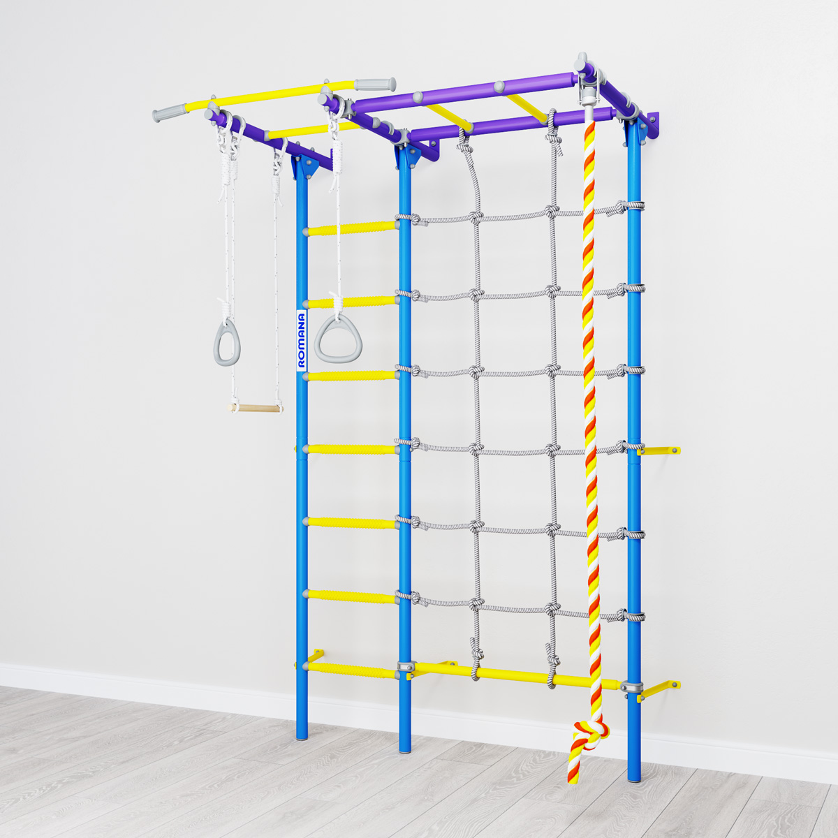 В детском спортивном комплексе ROMANA S7 есть все, что нужно юному искателю приключений: удобная лестница, веревочный лаз из прочного шнура, рукоход и турник. Также в комплекте идет навесное оборудование: канат, кольца и трапеция. Конструкция комплекса прочная и выдерживает человека весом 100 кг (нагрузка при испытаниях комплекса — 200 кг). Лестница снабжена массажными ступенями, хорошо развивающими тактильные ощущения и моторику.