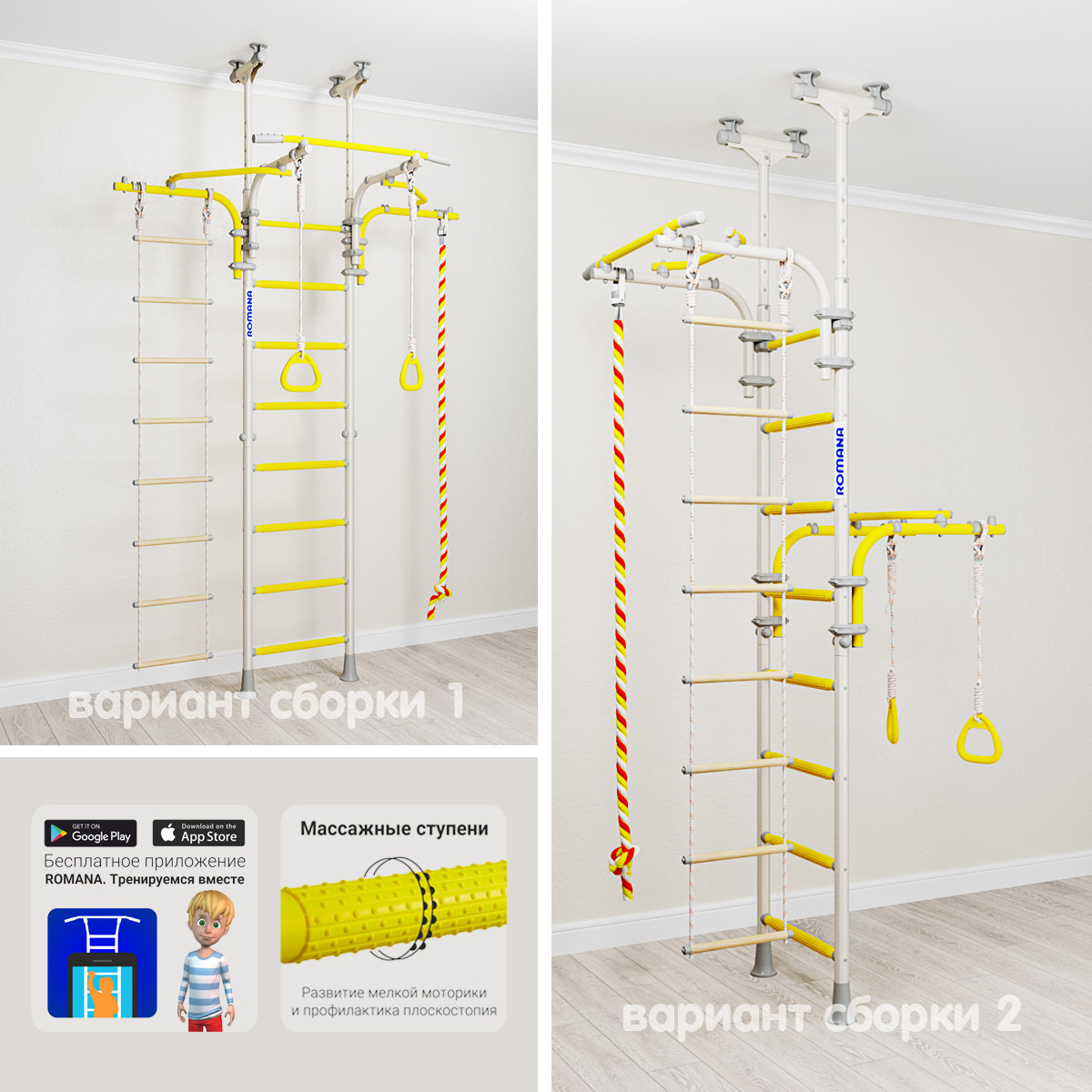 У комплекса ROMANA Transformer обновленная цветовая гамма — более яркая, насыщенная. Обновлены цвета стоек, навески, фурнитуры. Эта шведская стенка — не только полезное приобретение для здоровья и занятий спортом, но и красивый и функциональный предмет интерьера. Для того, чтобы занятия физкультурой стали еще интереснее, мы разработали бесплатное мобильное приложение «ROMANA. Тренируемся вместе». Скачивайте и играйте!