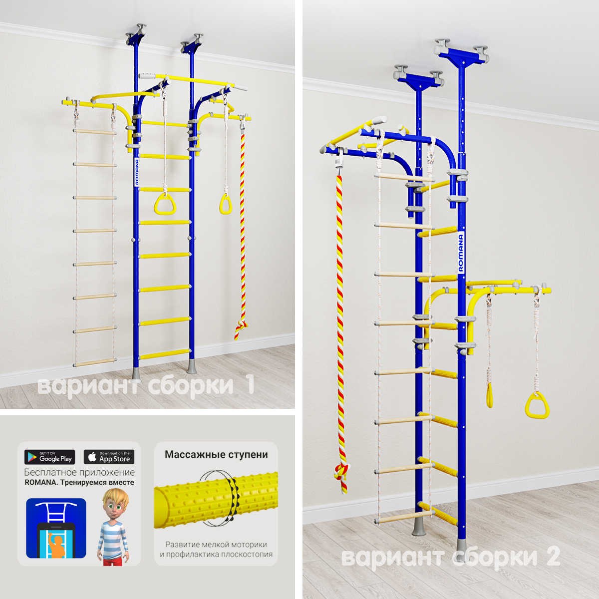 У комплекса ROMANA Transformer обновленная цветовая гамма — более яркая, насыщенная. Обновлены цвета стоек, навески, фурнитуры. Эта шведская стенка — не только полезное приобретение для здоровья и занятий спортом, но и красивый и функциональный предмет интерьера. Для того, чтобы занятия физкультурой стали еще интереснее, мы разработали бесплатное мобильное приложение «ROMANA. Тренируемся вместе». Скачивайте и играйте!