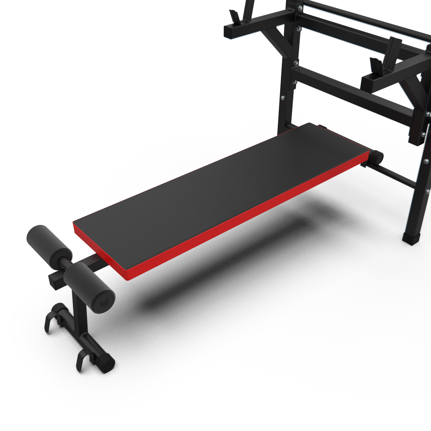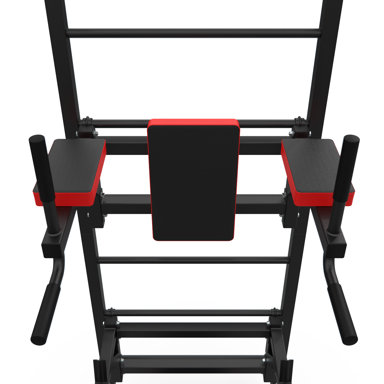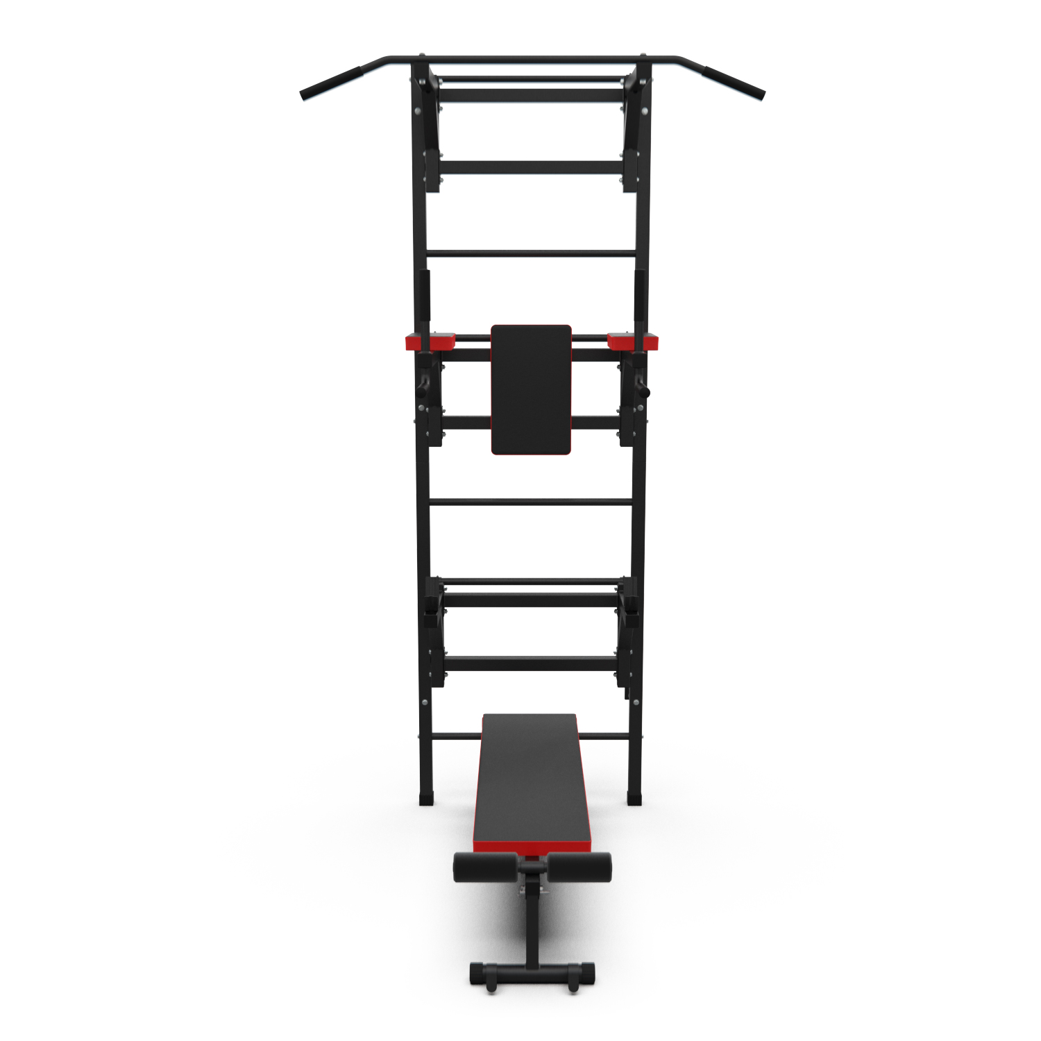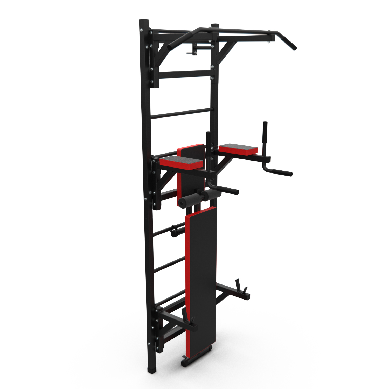 Турник длиной 99 см оснащён мягкими неопреновыми ручками, очень легко перевешивается на перекладины шведской стенки, что позволяет менять его высоту. Расстояние от ручек турника до шведской стенки (вынос турника) — 72 см. Вынос брусьев – 87 см, размер подушки под спину 42 х 25 см, а её толщина 5 см. Подушки подлокотников размерами 25 х 13 х 5 см, а поручни длиной 32 см диаметром 25 мм и толщиной стали 1,5 мм.