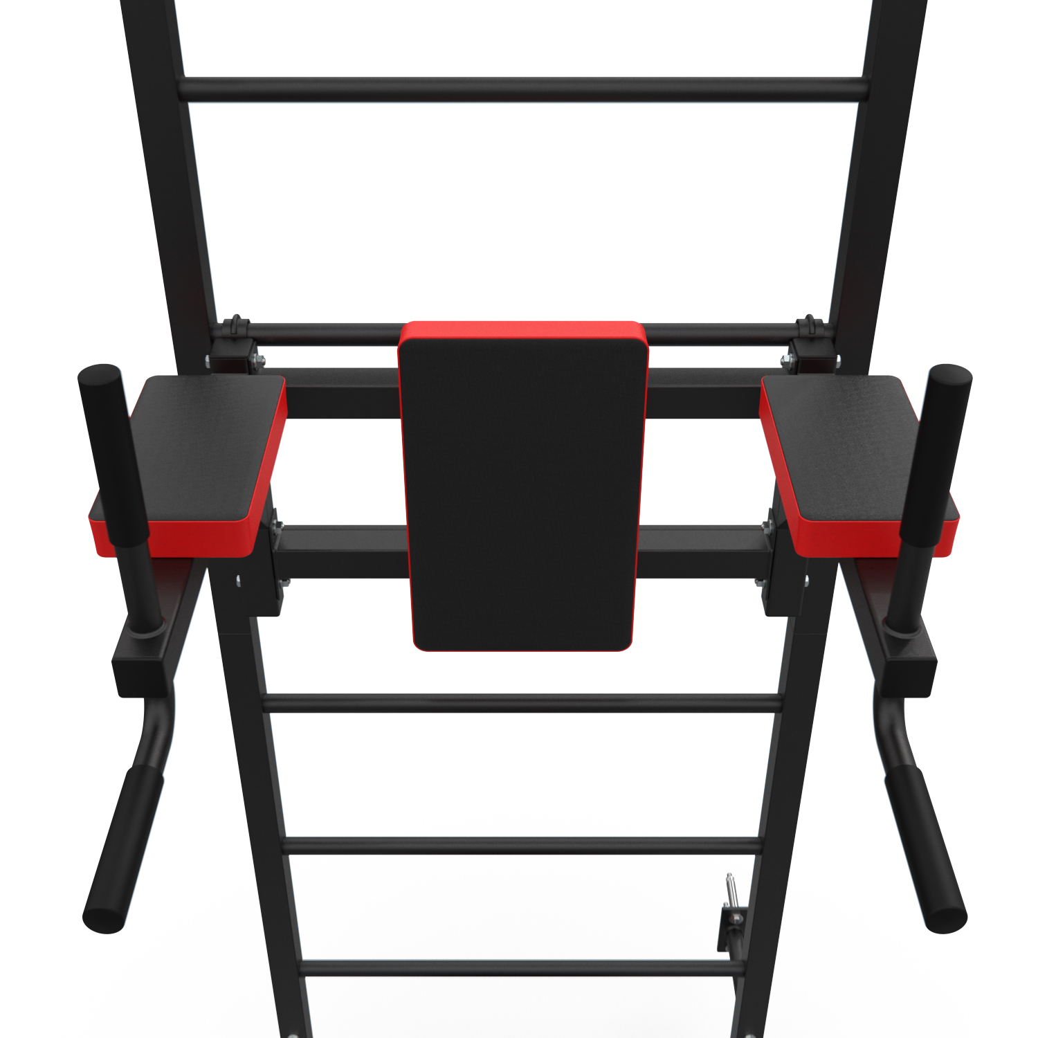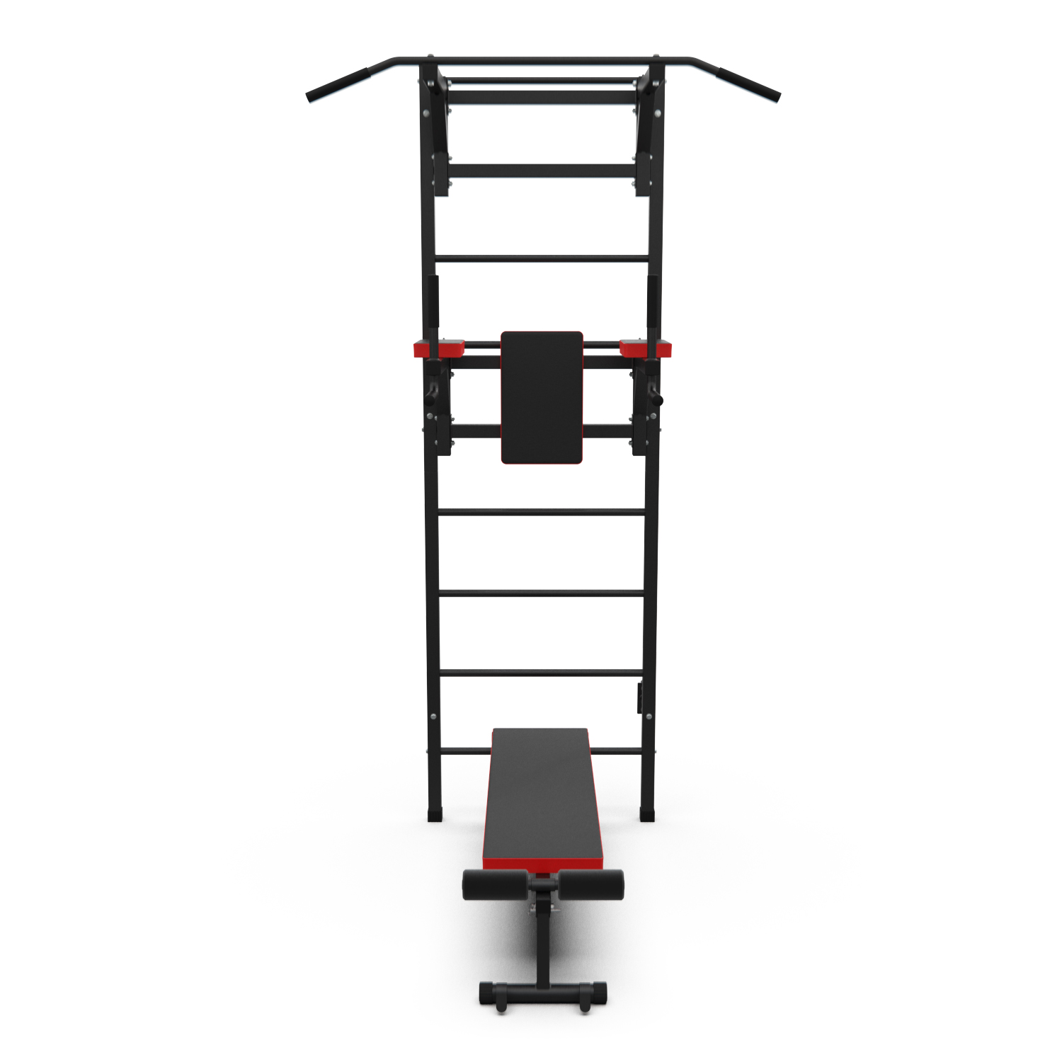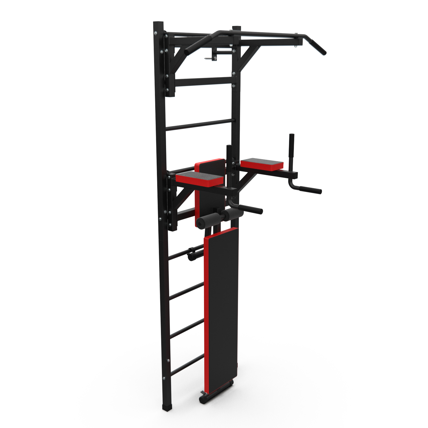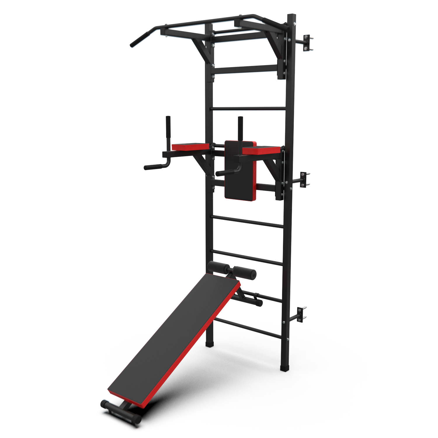 Турник длиной 99 см оснащён мягкими неопреновыми ручками, очень легко перевешивается на перекладины шведской стенки, что позволяет менять его высоту. Расстояние от ручек турника до шведской стенки (вынос турника) — 72 см. Вынос брусьев – 87 см, размер подушки под спину 42 х 25 см, а её толщина 5 см. Подушки подлокотников размерами 25 х 13 х 5 см, а поручни длиной 32 см диаметром 25 мм и толщиной стали 1,5 мм.