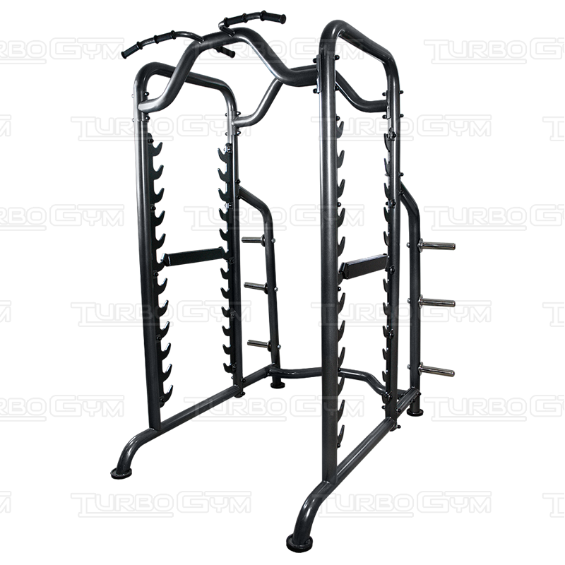 В зависимости от выполняемого сета гриф может располагаться на любой высоте в пределах от 40 до 200 см (шаг 14 см). Дополнительно многофункциональная рама оснащена турником с удобными рукоятками и накопителем для дисков, что делает занятия более комфортными и эффективными.