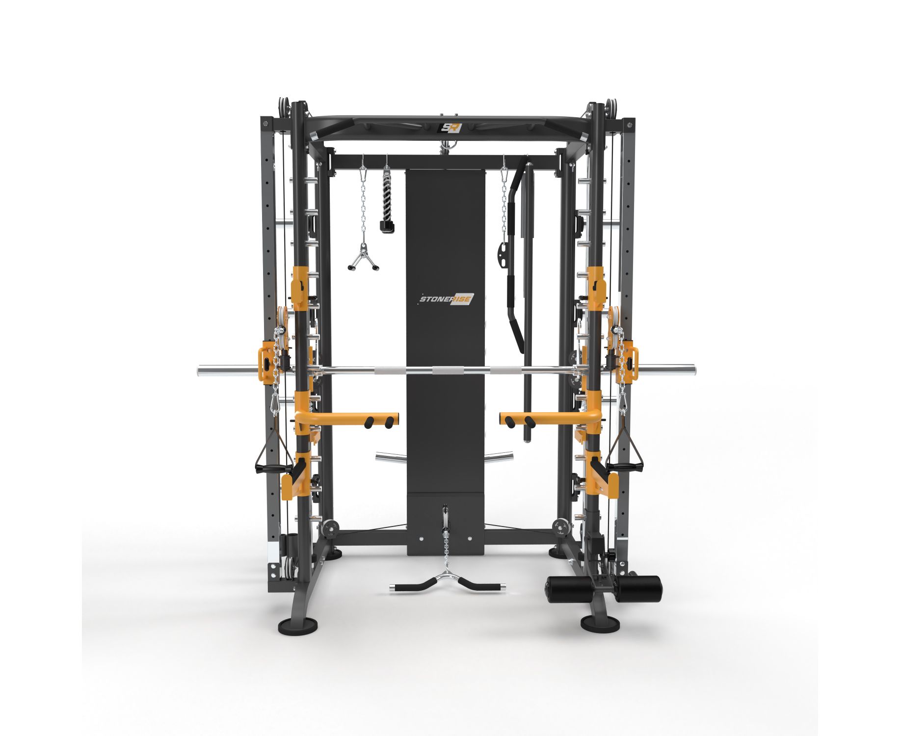 Силовая станция STONERISE чёрно-оранжевого цвета D910N с нейлоновыми шкивами. Благодаря множеству функций, данный тренажёр рассчитан на комплексное развитие мышц всего тела.
