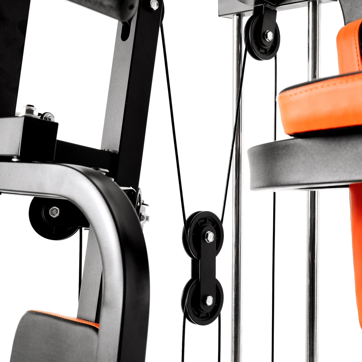 Комплекс не требует дополнительных снарядов — он полностью автономный. В комплект входит весовой стек массой 45 кг: 9 пластин по 4,5 кг и верхняя пластина 5 кг. Ролики на подшипниках обеспечивают плавное движение. Стальной трос толщиной 4 мм в защитной оплетке так же гарантирует безопасность при выполнении упражнений.