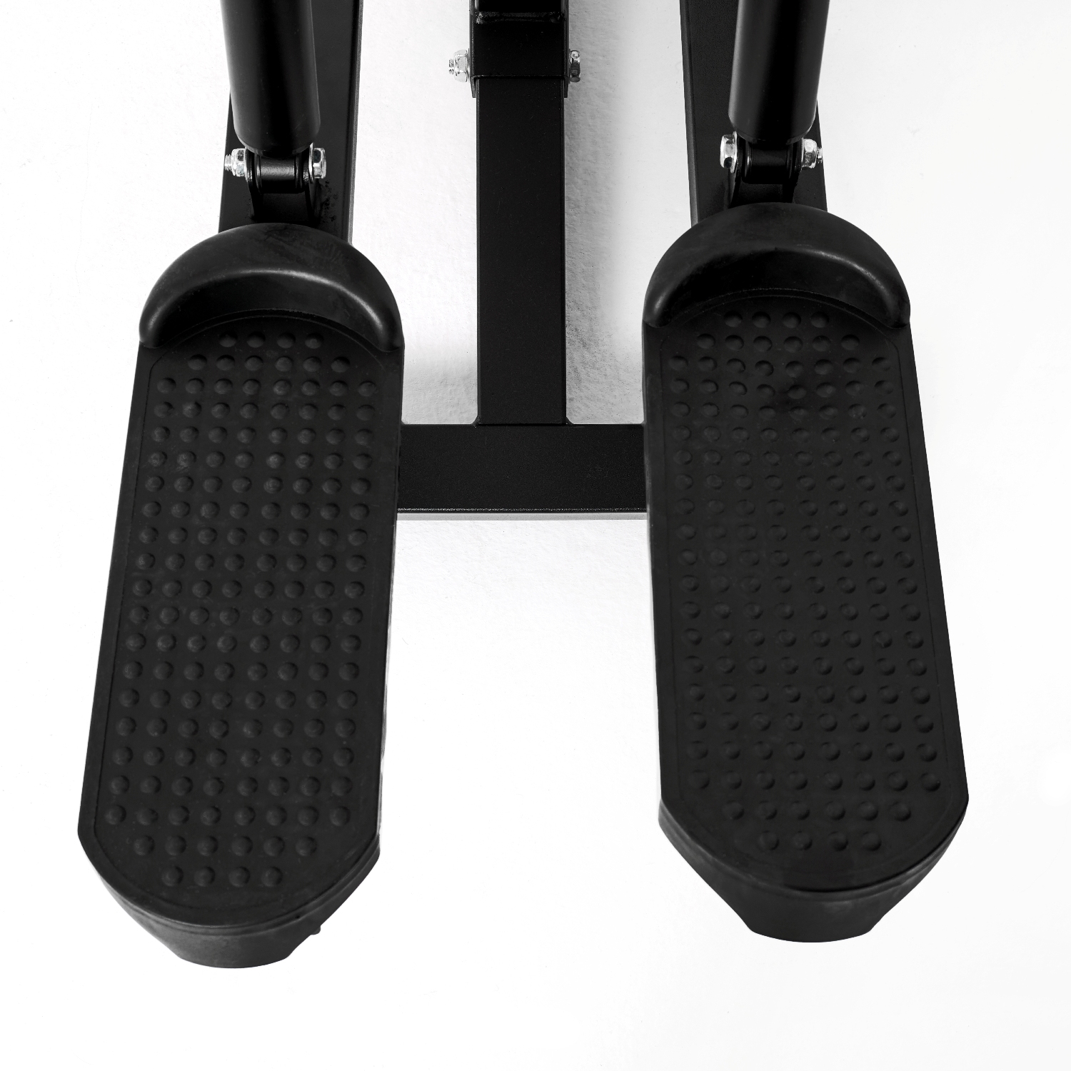 Степпер с гидравлическими цилиндрами служит не только для поддержки перед упражнениями на брусьях, но и для разогрева икроножных мышц. Размер педалей степпера составляет 33,5 х 11,5 см, расстояние между педалями 10,5 см.