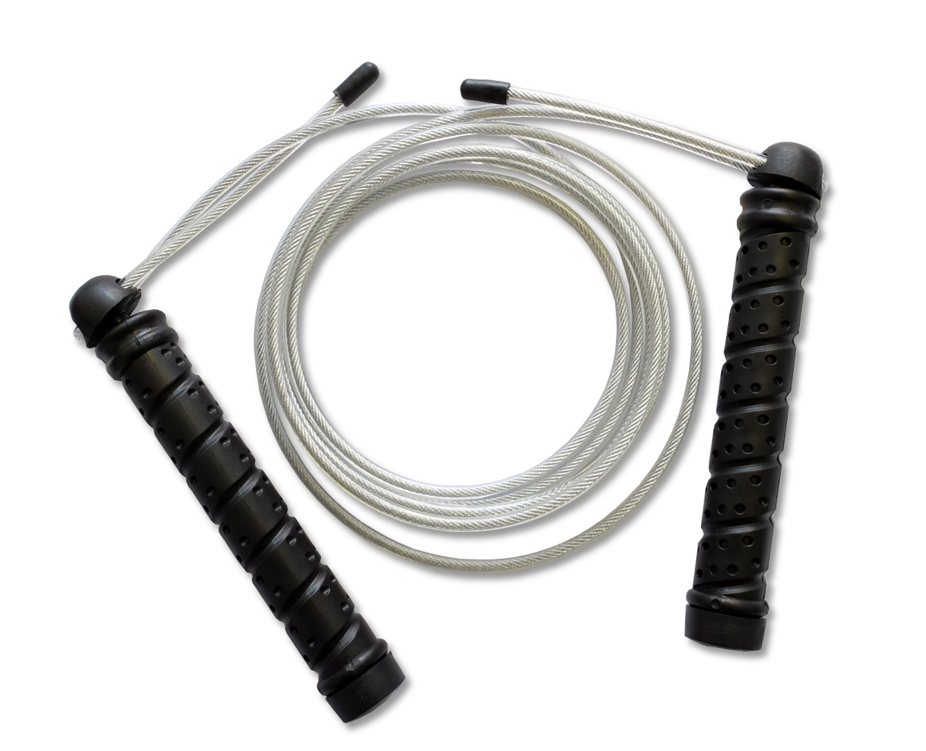 Скакалка имеет тонкий трос в пластиковой оплётке длиной 3,3 метра, что позволяет легко настроить её под нужный рост. Удобные прорезиненные ручки диаметром 17 см изготовлены из высокопрочного пластика и обеспечивают комфортный хват благодаря своему переменному диаметру. Встроенный в ручки подшипник обеспечивает идеальное вращение.