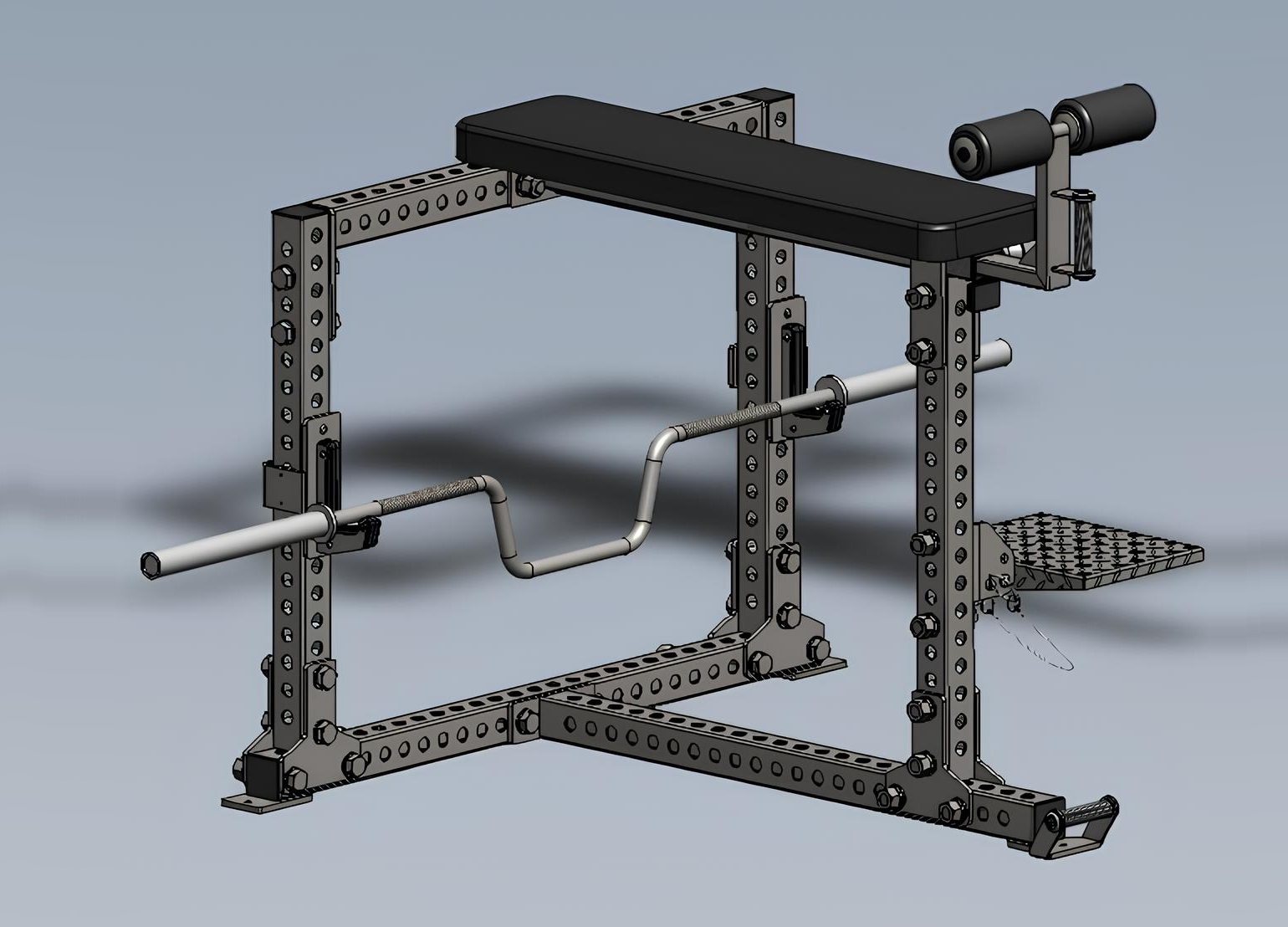 Скамья имеет широкую опору, обеспечивающую устойчивое положение при работе с большим весом. Изготовлена из мощной трубы 80х80мм. Для атлетов невысокого роста предусмотрена ступенька с возможность регулировки высоты. Скамью обладает высокой мобильностью, за счет наличия рукояти перемещения и колёсиков. В комплект входит пара крюков, с износостойким пластиком, который сохранит насечку на вашем грифе, а также возможностью регулировкой по высоте, под разную длину конечностей занимающегося. Уникальность нашего изделия в том, что мы добавили упор для ног, который предотвратит излишний изгиб тела, при работе с большими весами, а также возможностью регулировки вылета этого упора под рост атлета. Удобная и мягкая подушка, обтянута износостойкой ЭКО кожей, обеспечит отличное сцепление с телом атлета.