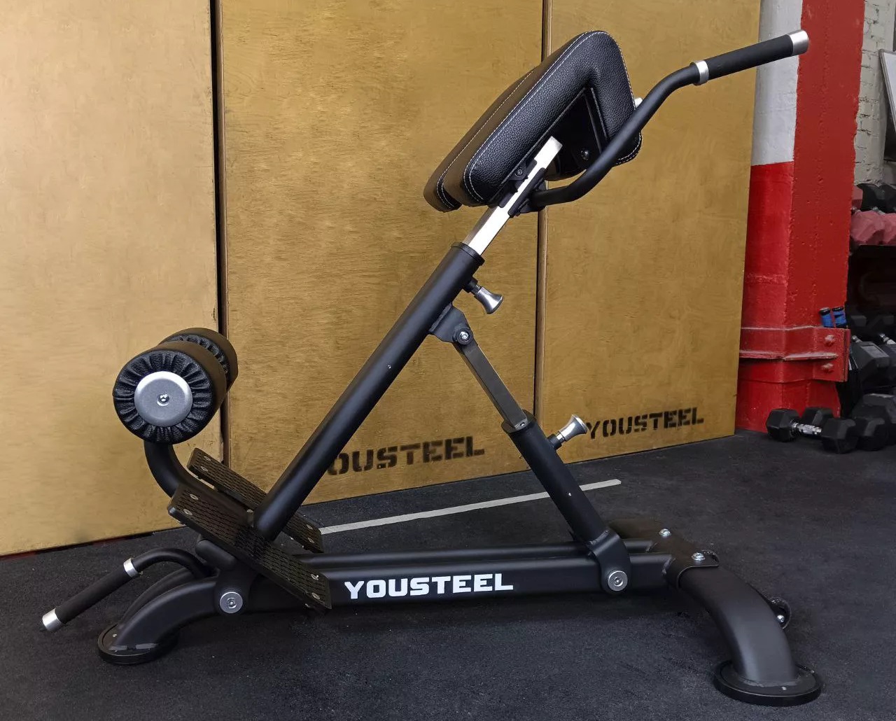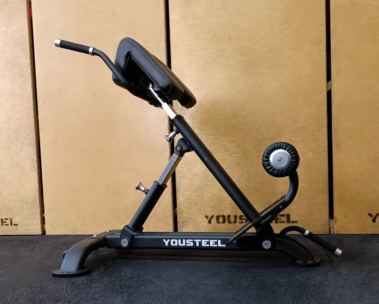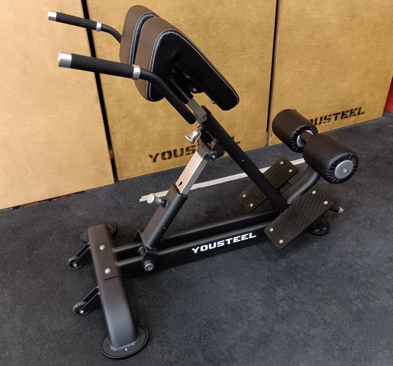 Тренажер скамья-гиперэкстензия предназначен для тренировки сгибателей бедра, ягодичных мышц и создания прочного сухожильного корсета позвоночника. Этот вид тренинга считается наименее травматичным, поэтому рекомендуется даже новичкам и людям, имеющим слабую спину. Благодаря делительной колодке, которая изменяет положение ножного упора, тренажер можно отрегулировать под индивидуальные габариты спортсмена и сделать тренировки максимально продуктивными. Изделие имеет 4 угла регулировки наклона: 43°, 47°, 50°, 54°.
