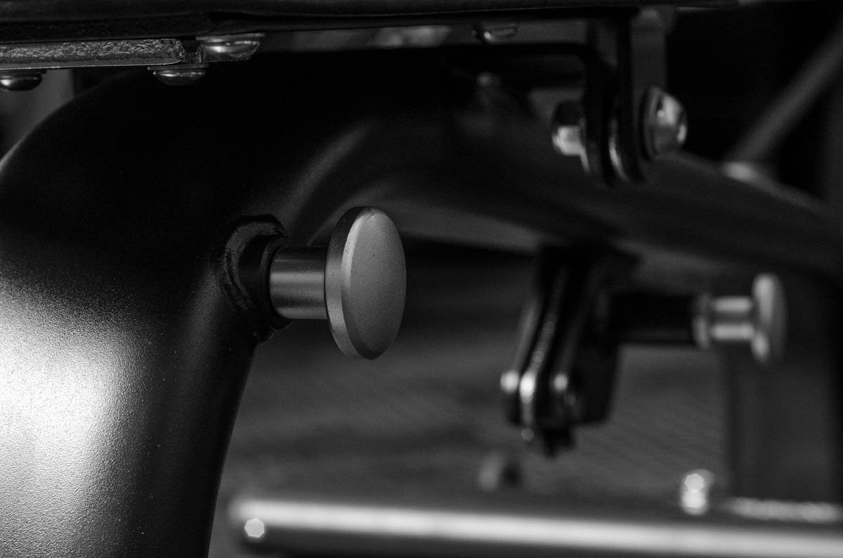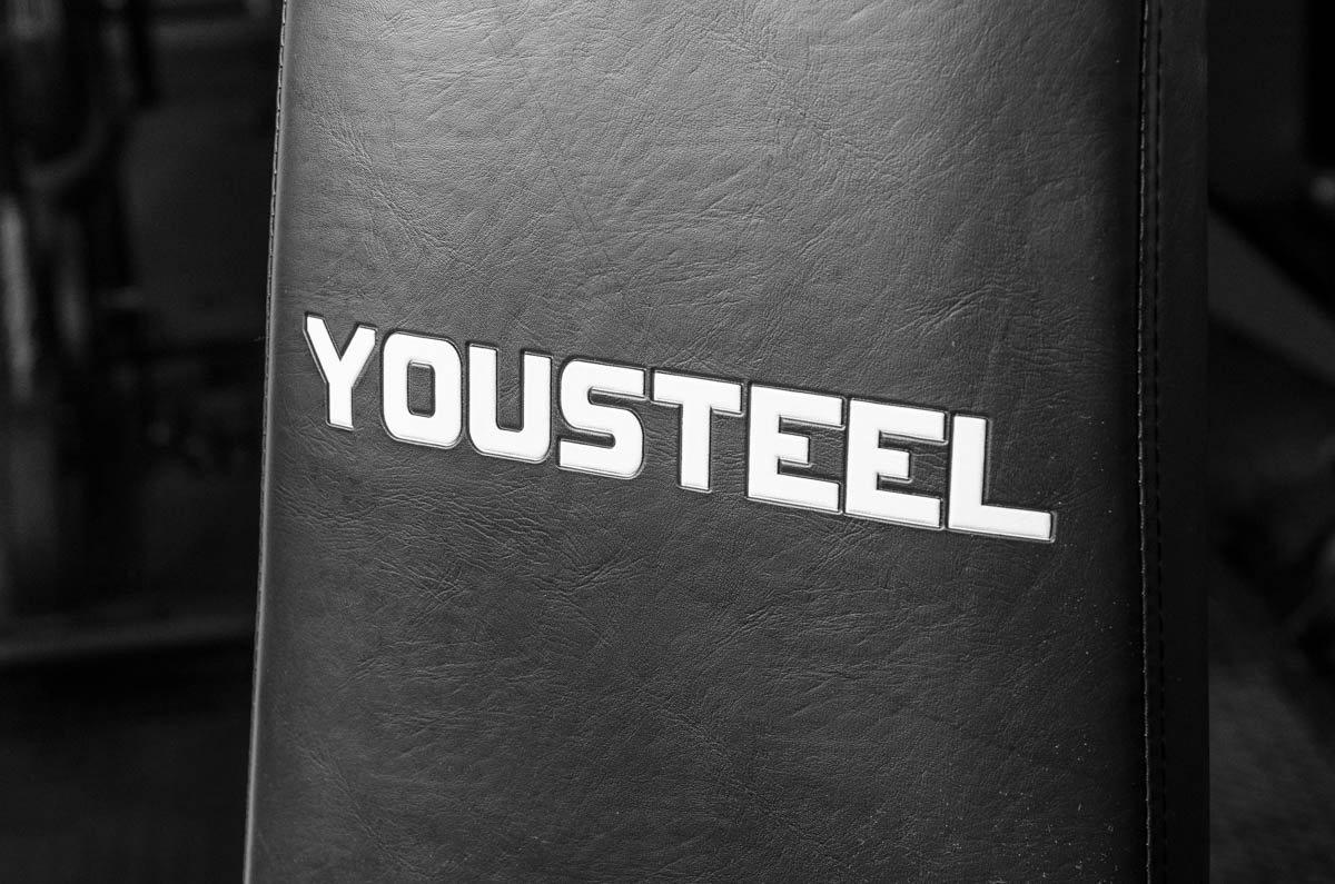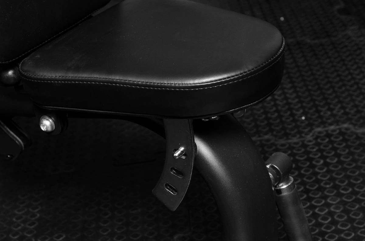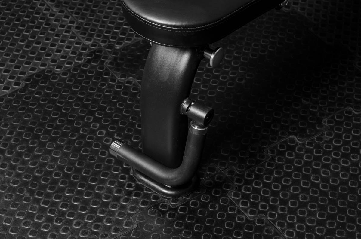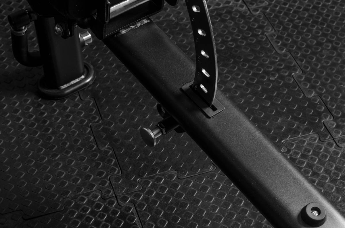 Скамья состоит из 2 подвижный частей, которые фиксируются с помощью подпружиненного болта с алюминиевой головой. Диапазон регулировки от прямого до отрицательного угла по отношению к горизонту. Для его фиксации есть множество отверстий. Каждое отверстие пронумеровано. Рама сделана из овальной трубы. Подушки по краям закруглены. Общий внешний вид стильный и гармоничный. Мягкие части обиты устойчивой к истиранию эко кожей. Рама покрыта порошковой краской. Все черного цвета. Форма опоры в виде буквы Т обеспечивает хорошую устойчивость. 2 колесика и ручка на противоположной стороне упрощают перемещение снаряда по залу – подняли и покатили.