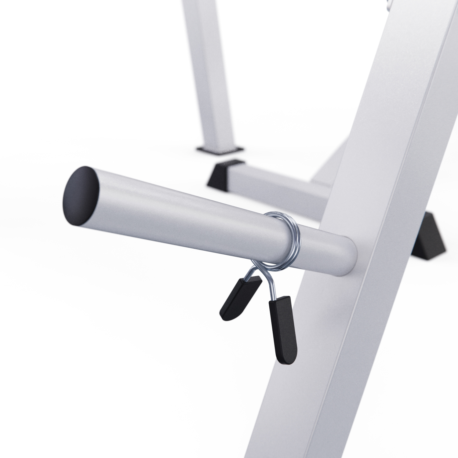Скамья для жима имеет посадочное место для хранения дисков 25 мм. Длина посадочного места равна 20 см, а в комплекте идут 2 пружинных замка.