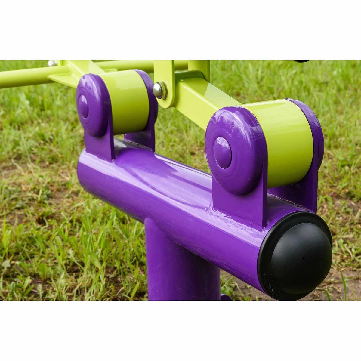 Оборудование состоит из опорного столба, сиденья со спинкой и упором для ног, рычага с рукоятями и закладной. Закладная монтируется в грунт и заливается бетоном. Опорный столб крепится к закладной за счет фланцевого соединения и отсыпается песчано-гравийной смесью до уровня площадки. Фланцевое крепление позволяет надёжно смонтировать оборудование и беспрепятственно демонтировать при необходимости обслуживания. Монтажные схемы прилагаются к комплекту поставки.